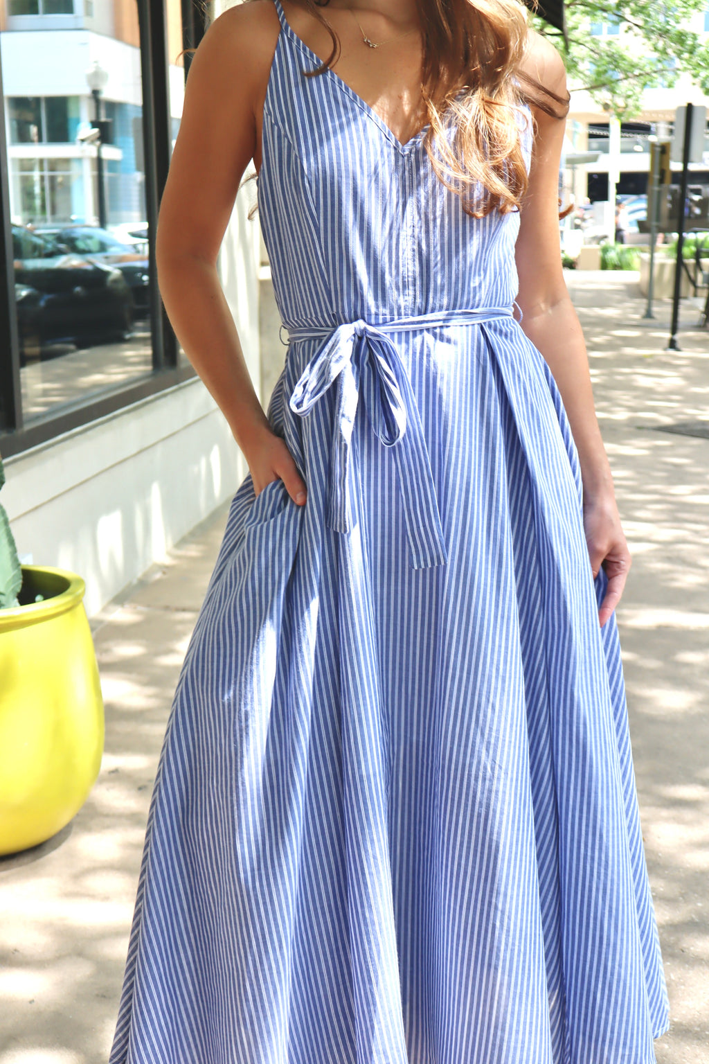 STRIPED FIT FLARE MIDI DRESS- BLUE