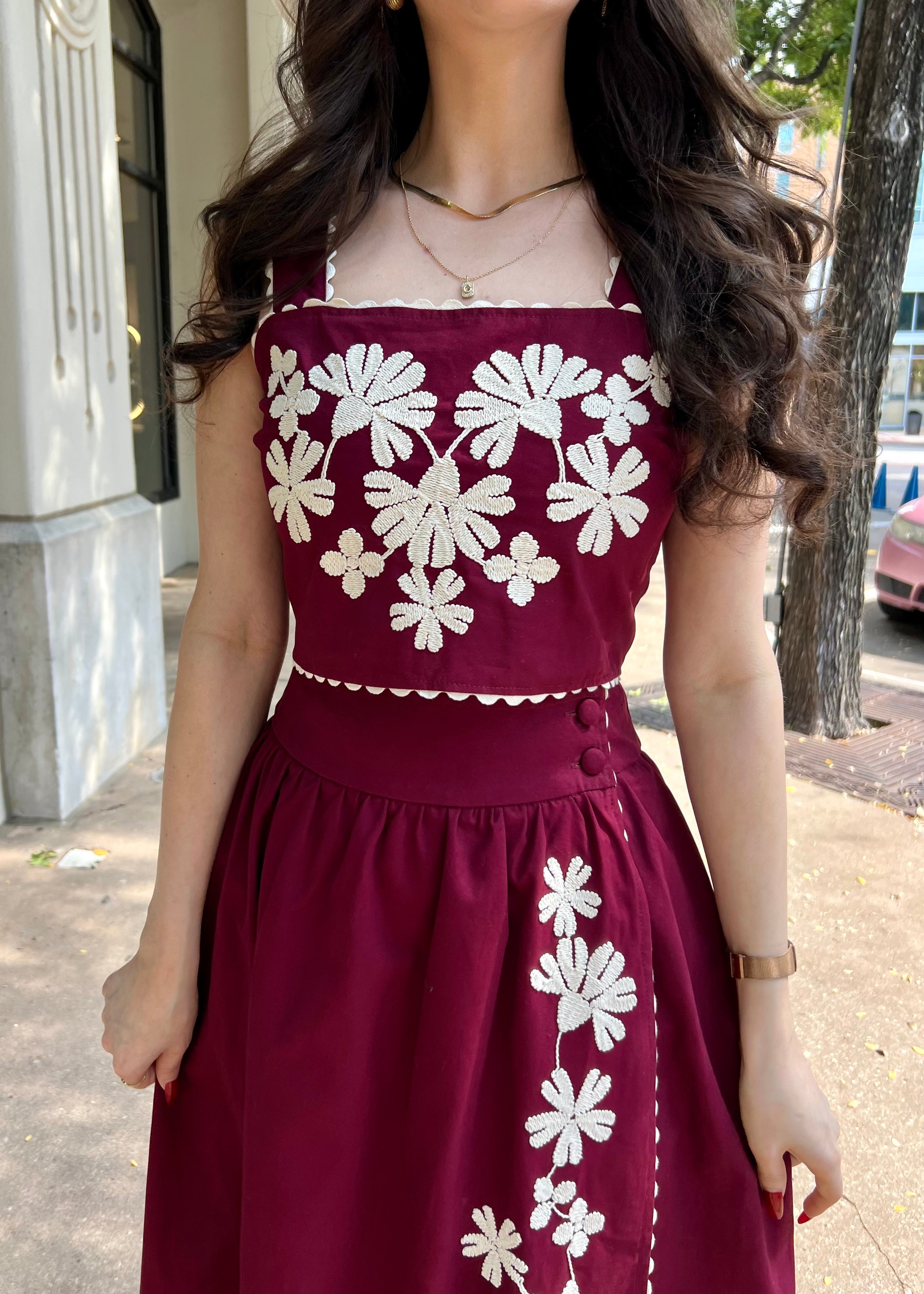 FLORAL EMBROIDERED MIDI SKIRT- BURGUNDY