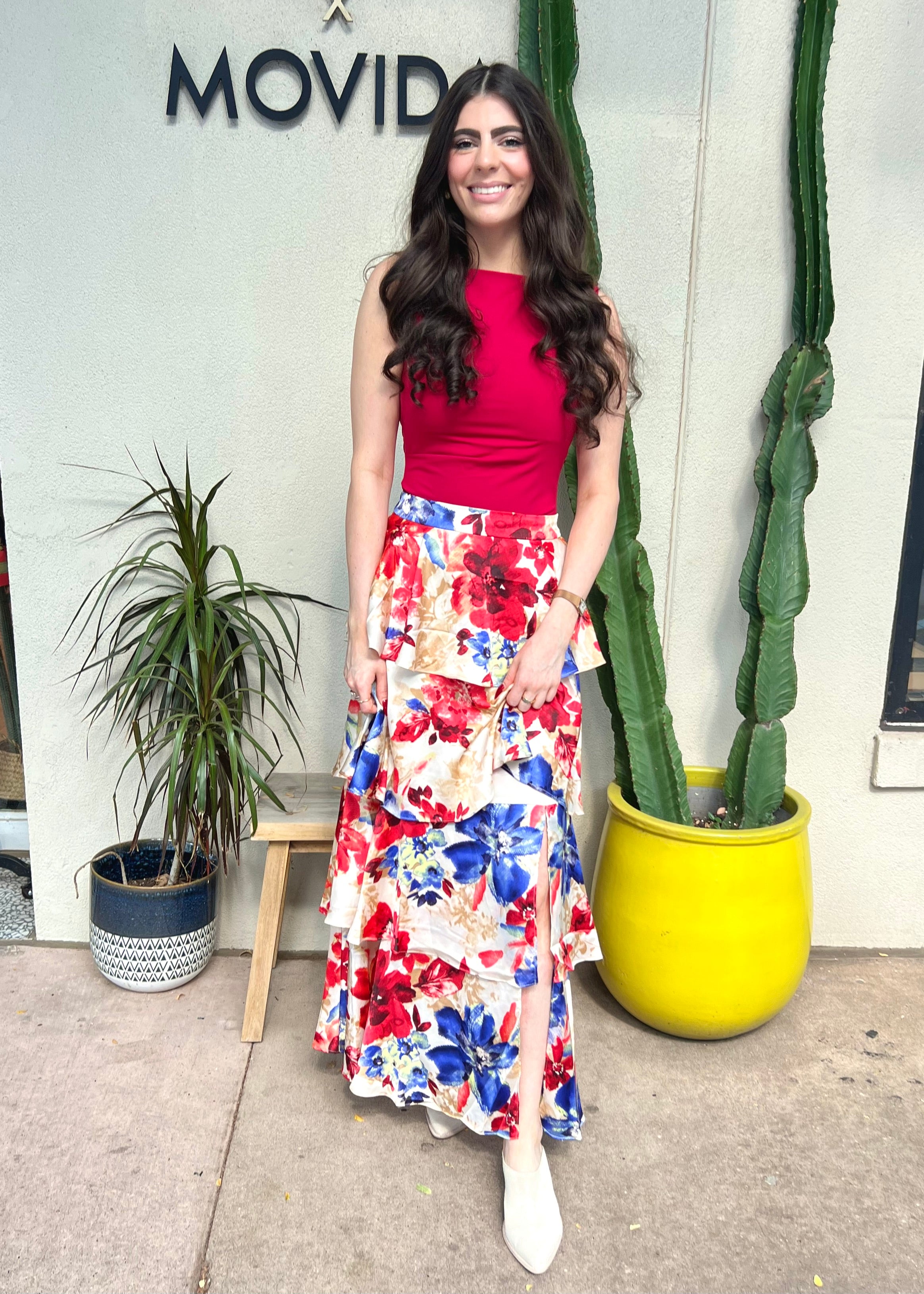 FLORAL TIERED MAXI SKIRT- IVORY/RED