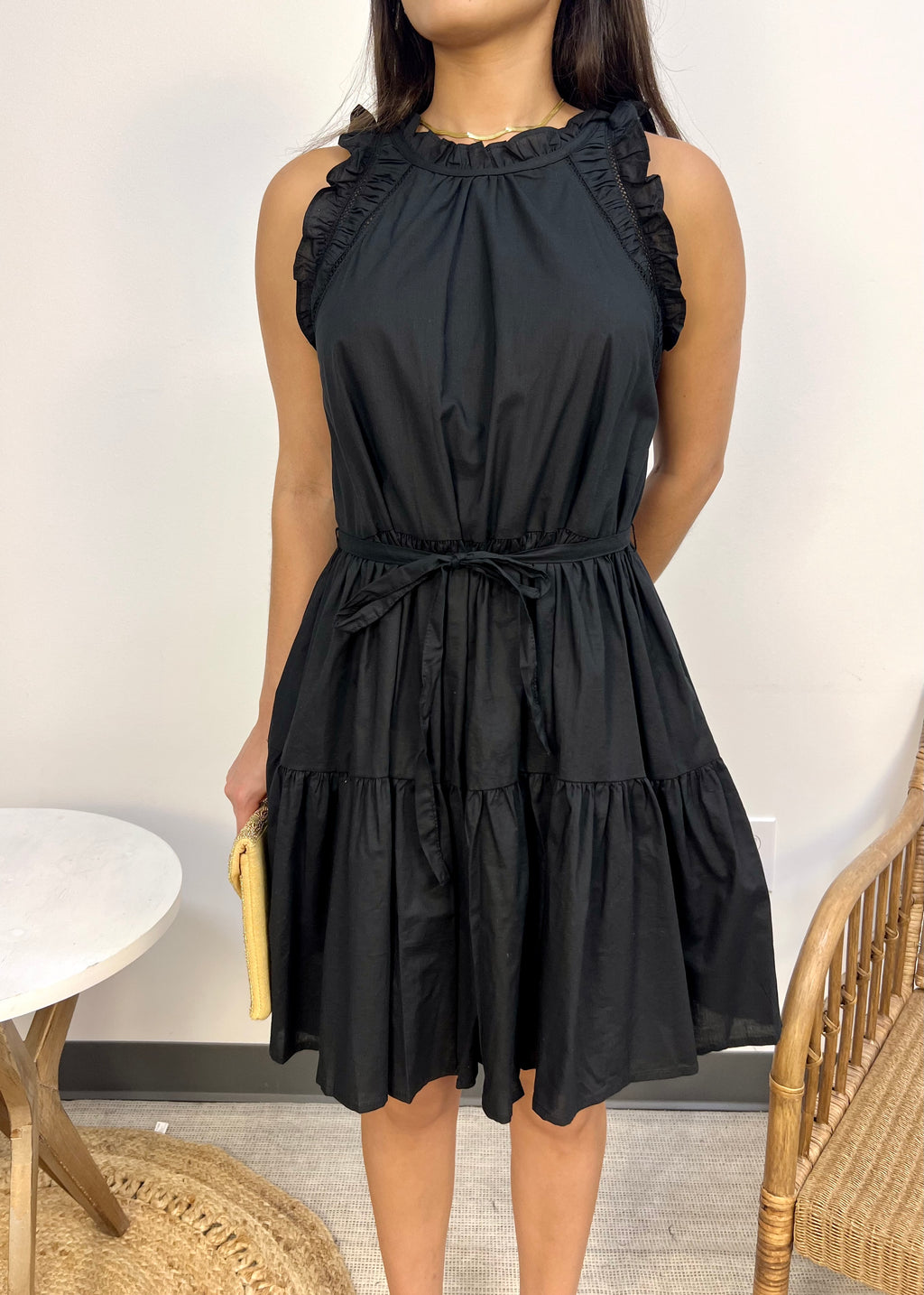 POPLIN RUFFLE SLV TIERED DRESS- BLACK