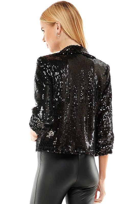 Cropped sequin blazer with ruched sleeves. Fully lined.