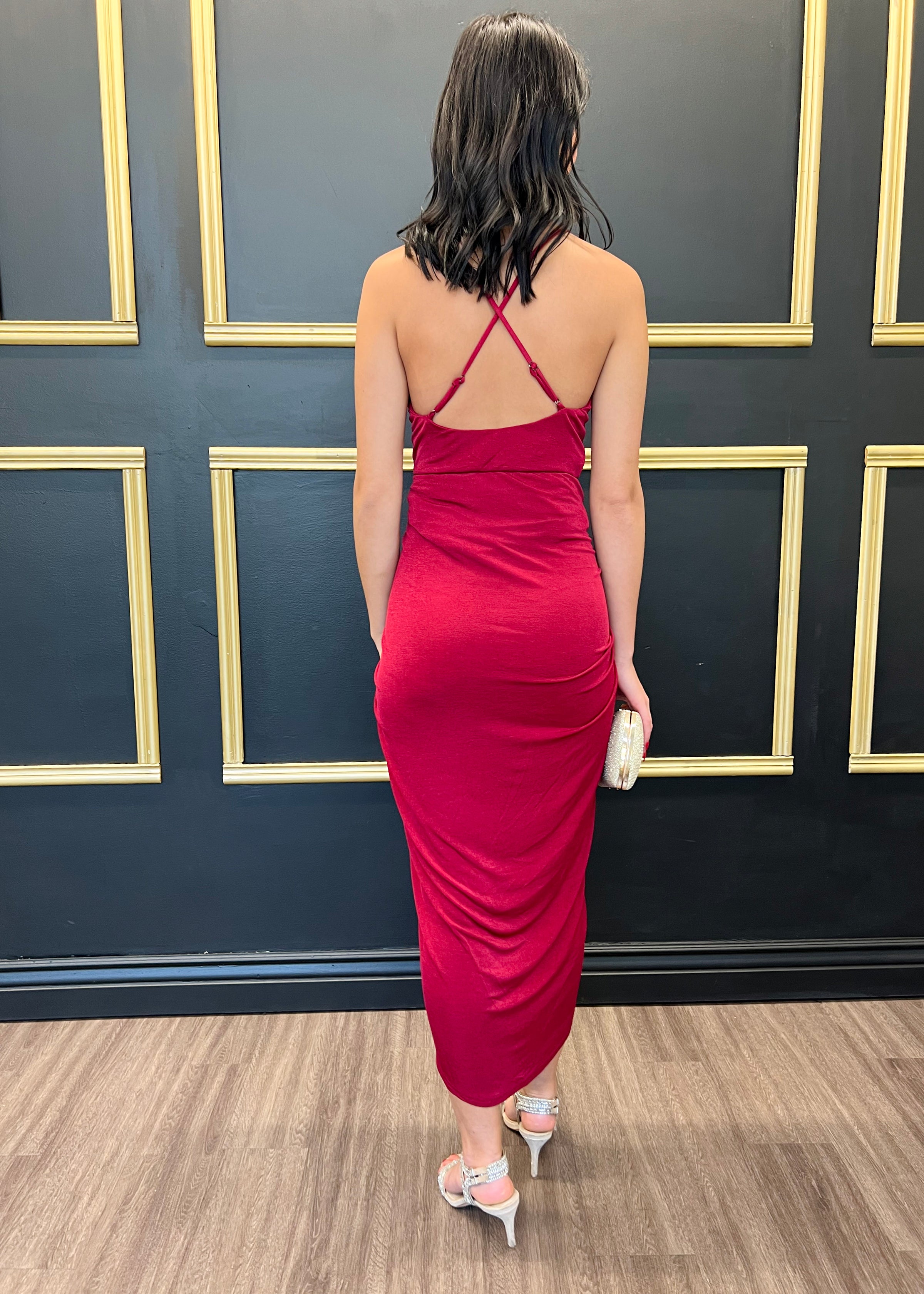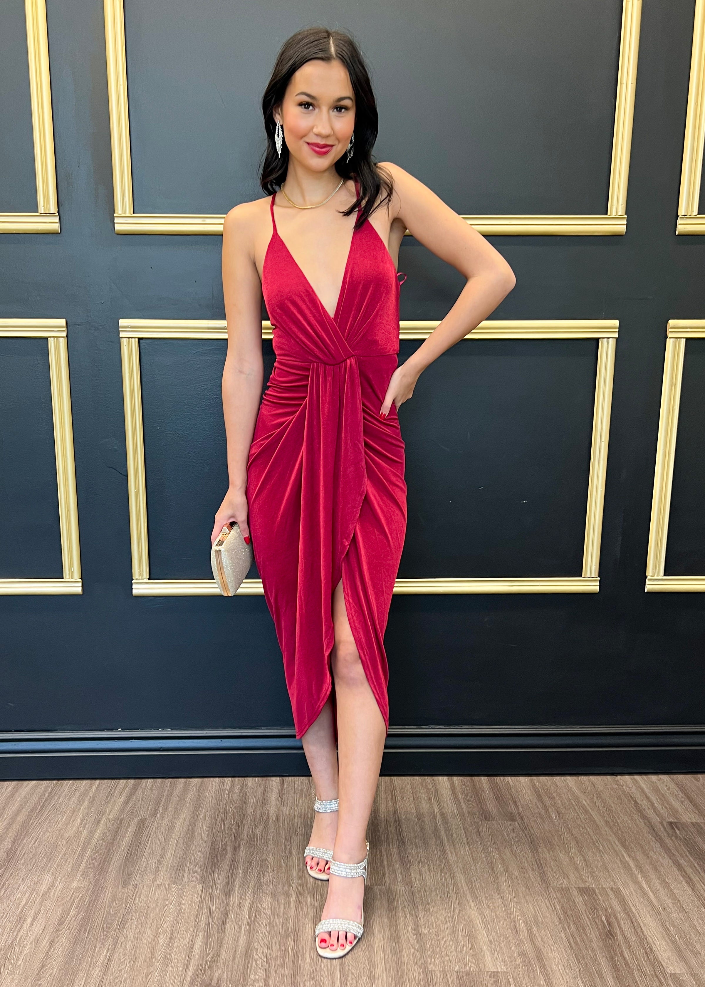 Look chic for your event in the Naomi Dress in a deep red that features a front drape detail, deep front v neckline and an adjustable x back straps. Designed in a slinky stretch fabrication, no zipper closure.