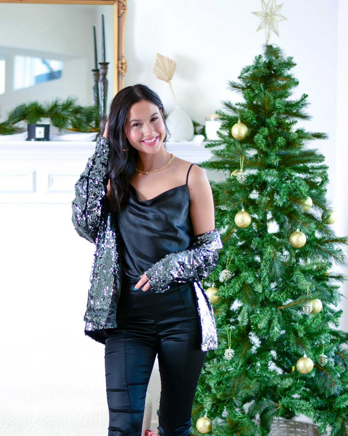 BOYFRIEND SEQUIN BLAZER IN A DEEP CHROME COLOR FEATURES A RUCHED SLEEVE.