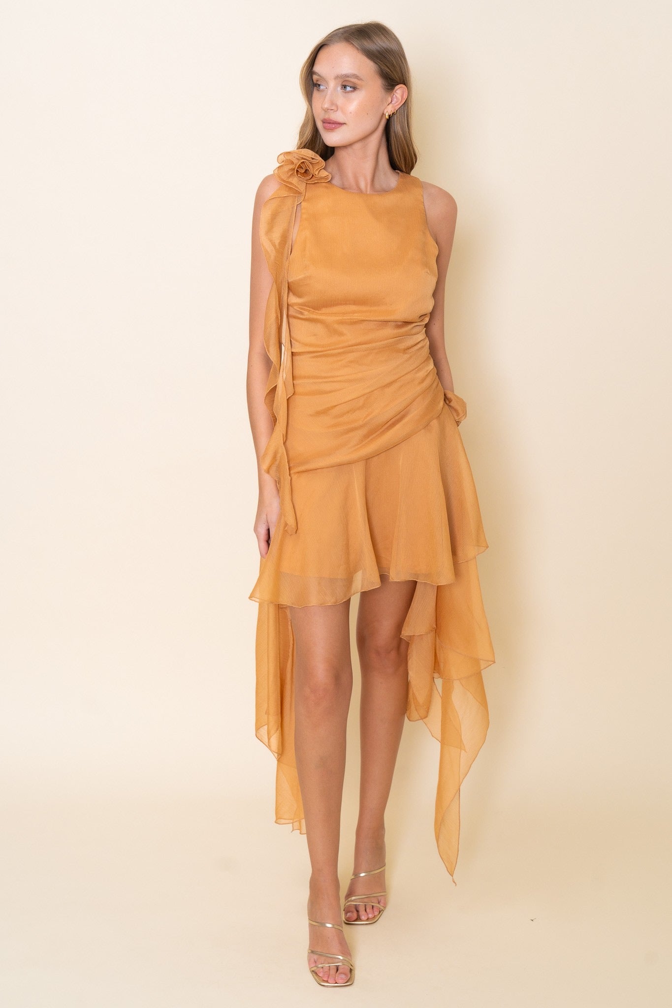 3D ROSE RUFFLED MINI DRESS- CAMEL