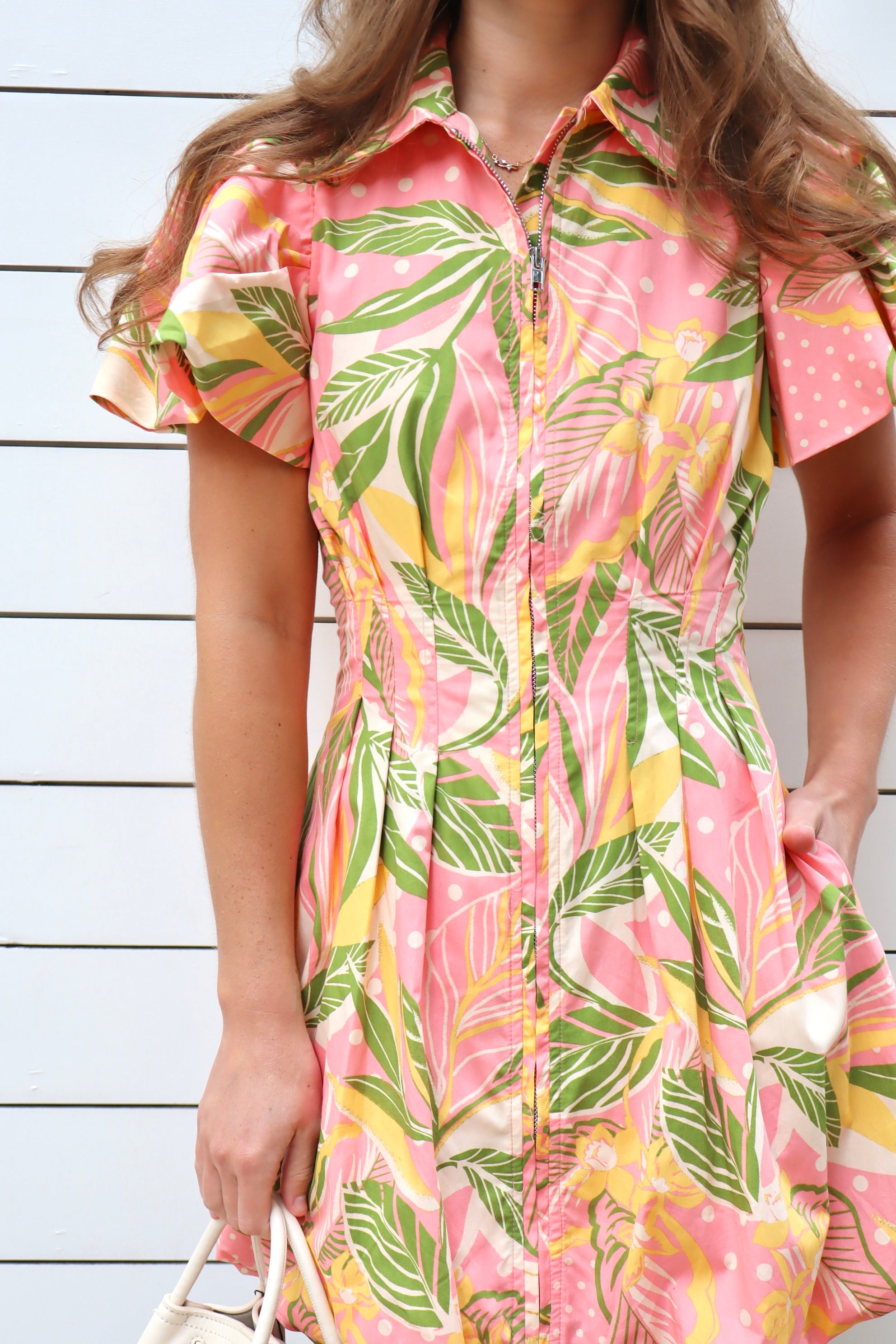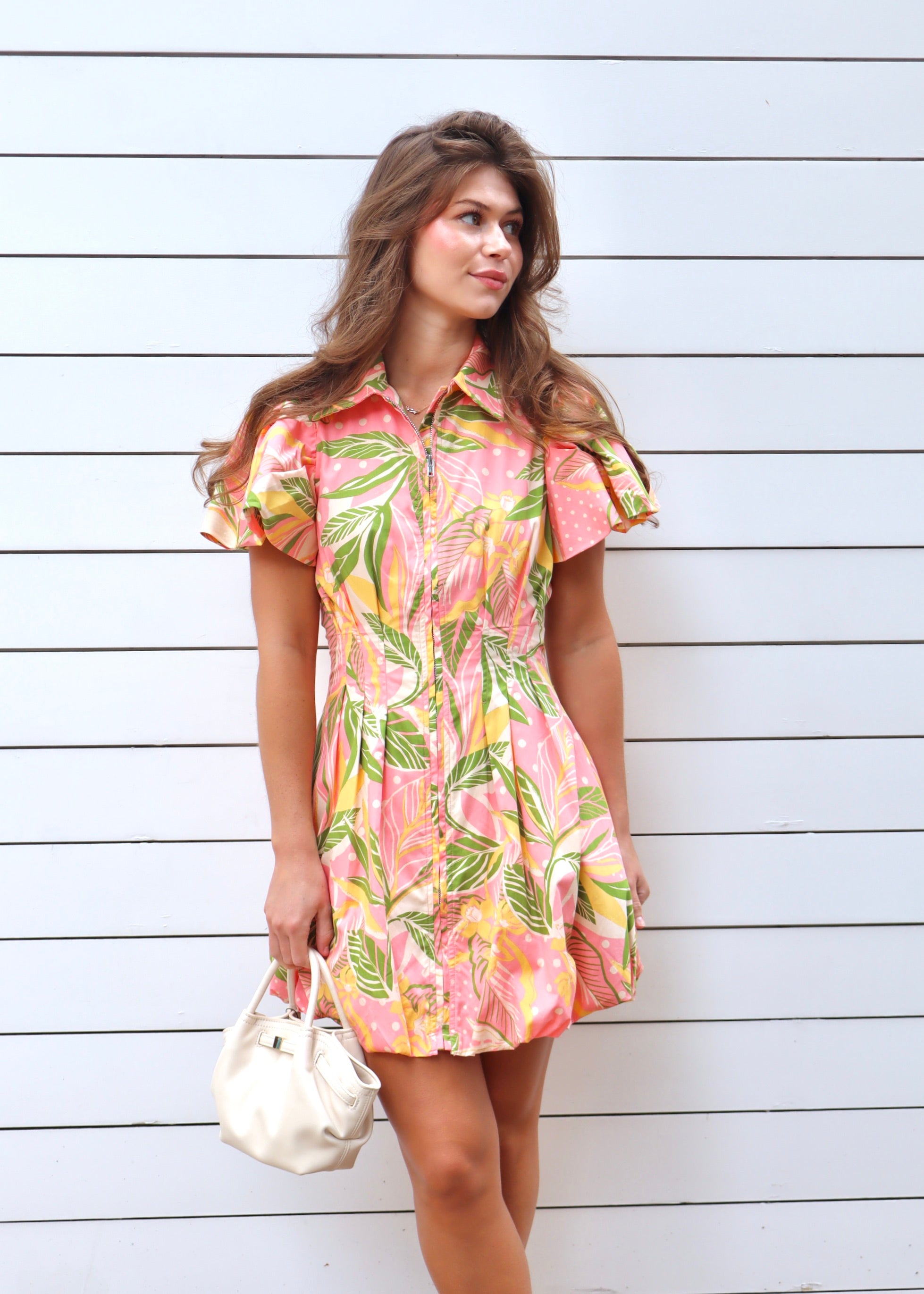 Our Addison Tropical Puff Sleeve Mini Dress features statement puff sleeves with a playful, voluminous silhouette and a lightweight tropical floral print with a front zipper closure and bubble hem. Model is 5'2" and wearing a size small.