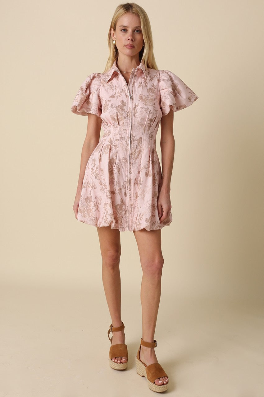 Our Delaney Floral Bubble Mini Dress features a a feminine, vintage inspired silhouette in a soft allover floral print and lightweight linen blend fabric. Designed with a classic collar neckline with a front zipper closure detail, this mini dress is finished with dramatic bubble sleeves and hem with a softly gathered waist for movement and shape.