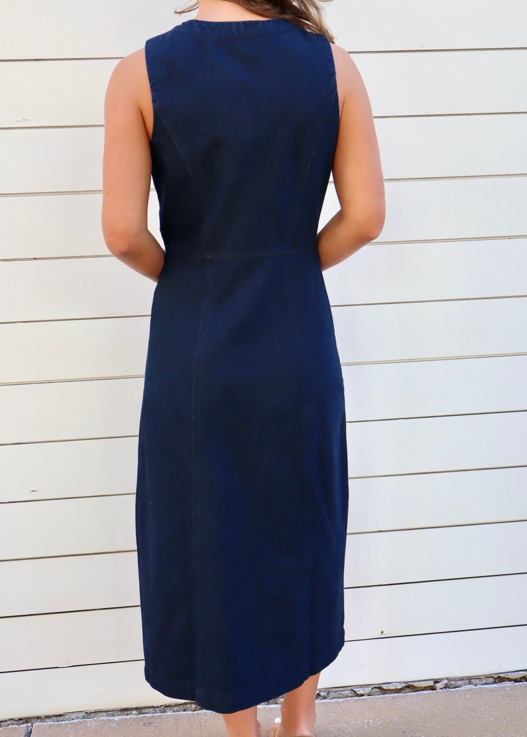Sleeveless denim midi dress with gold button down closure. Model is wearing a size small.