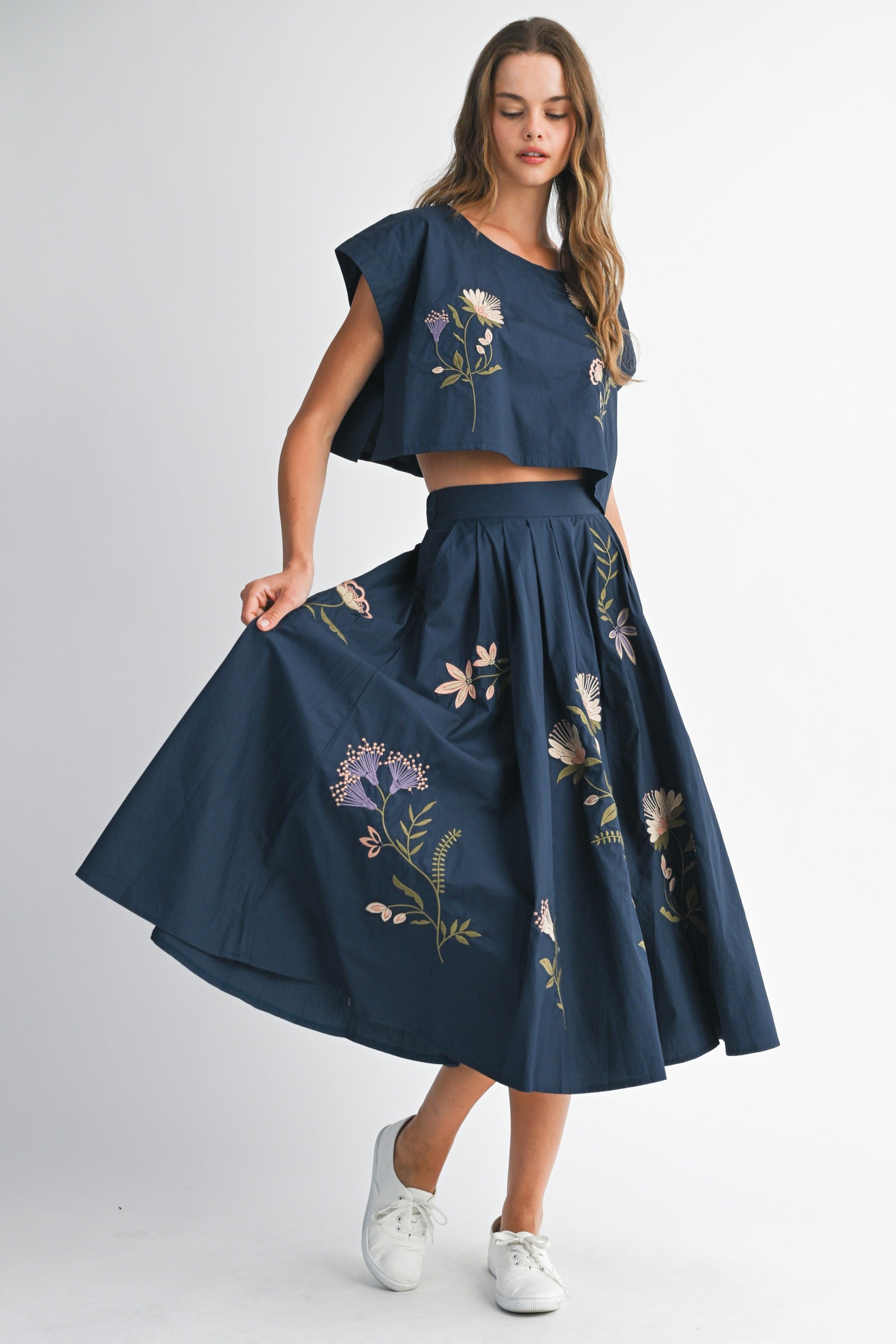 EMBROIDERED MIDI SKIRT- NAVY