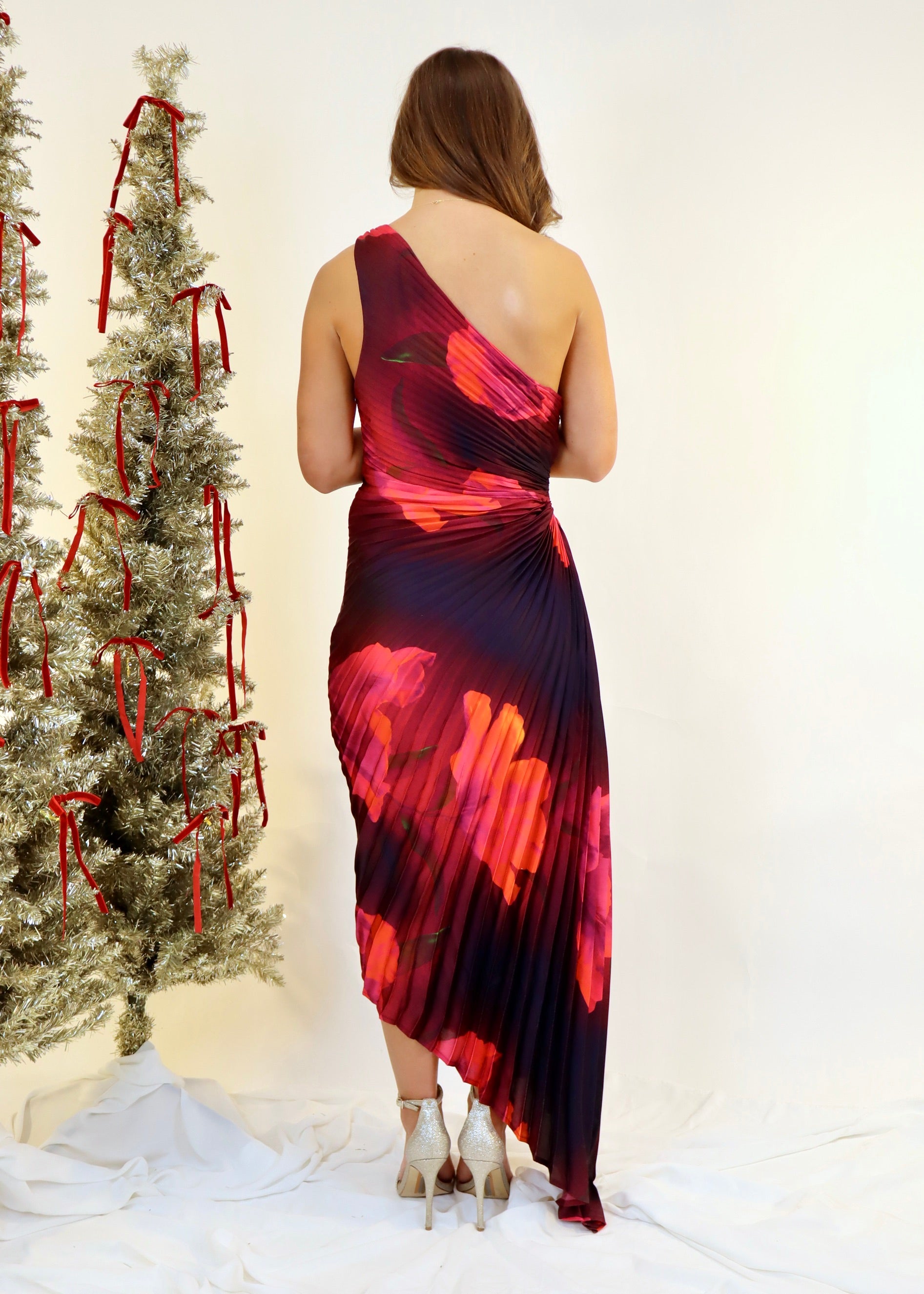 FLORAL ONE SHOULDER PLEATED DRESS- PLUM ROSE