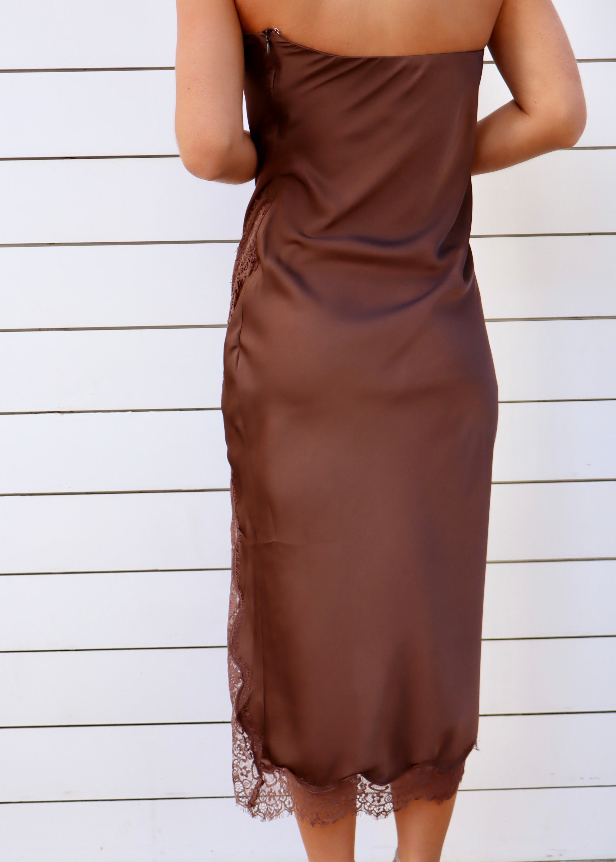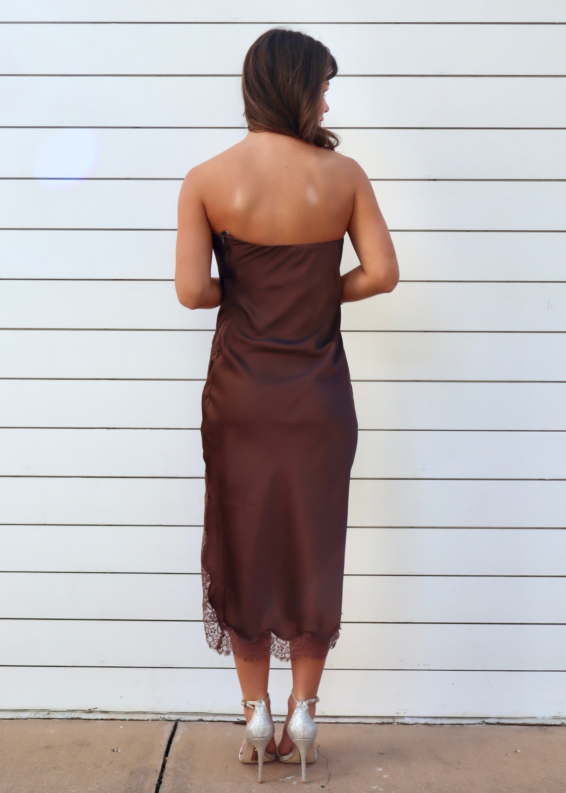 LACE STRAPLESS SLIT DRESS- CHOCOLATE