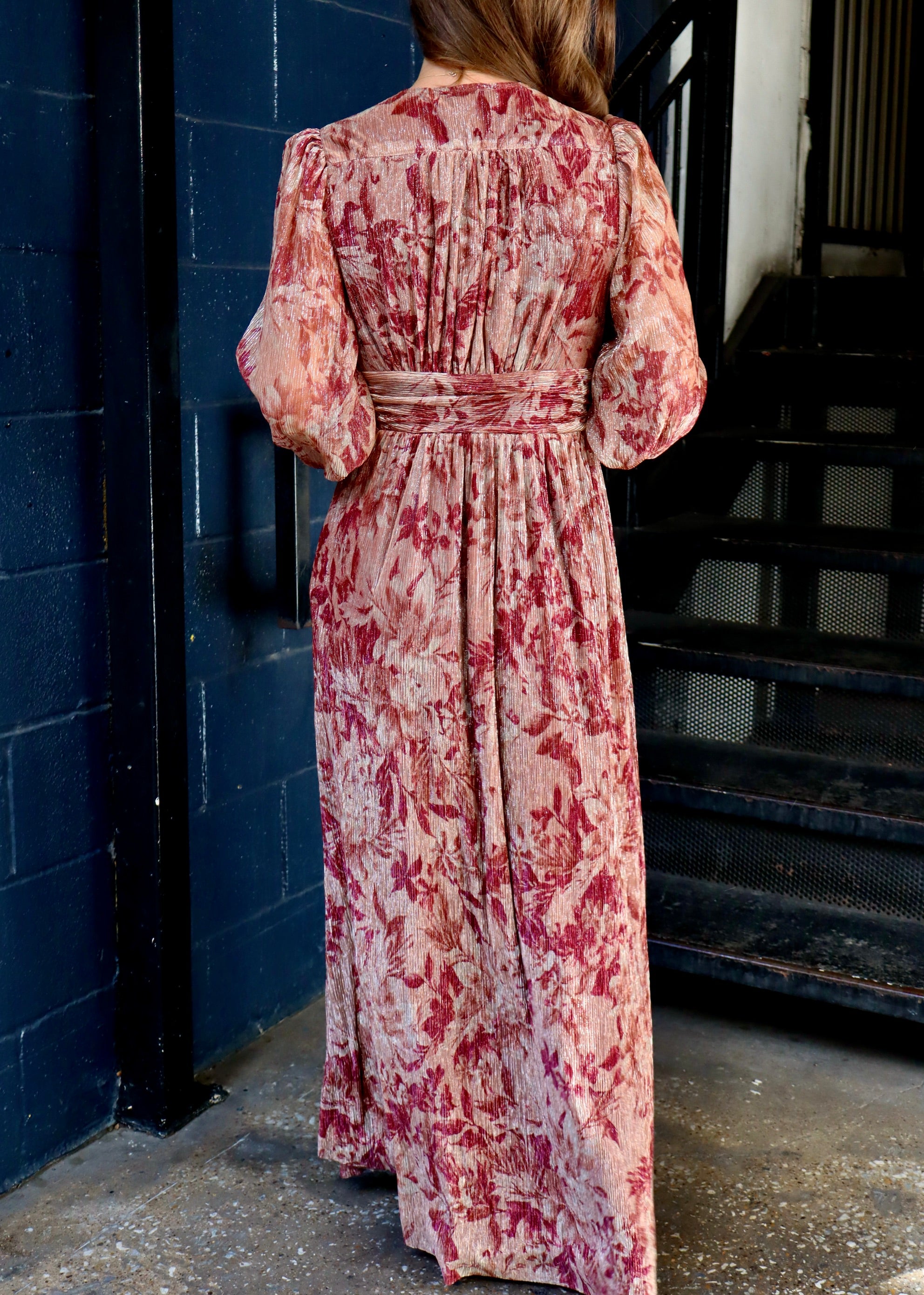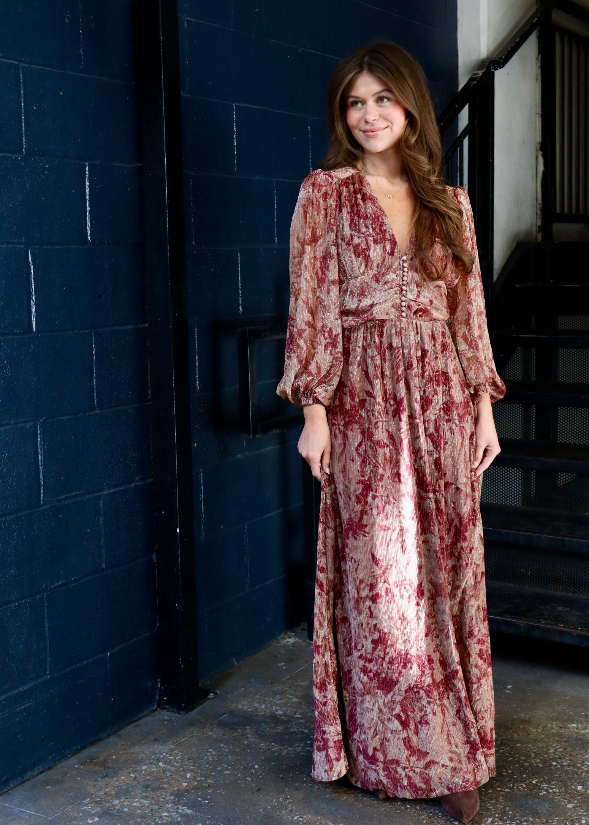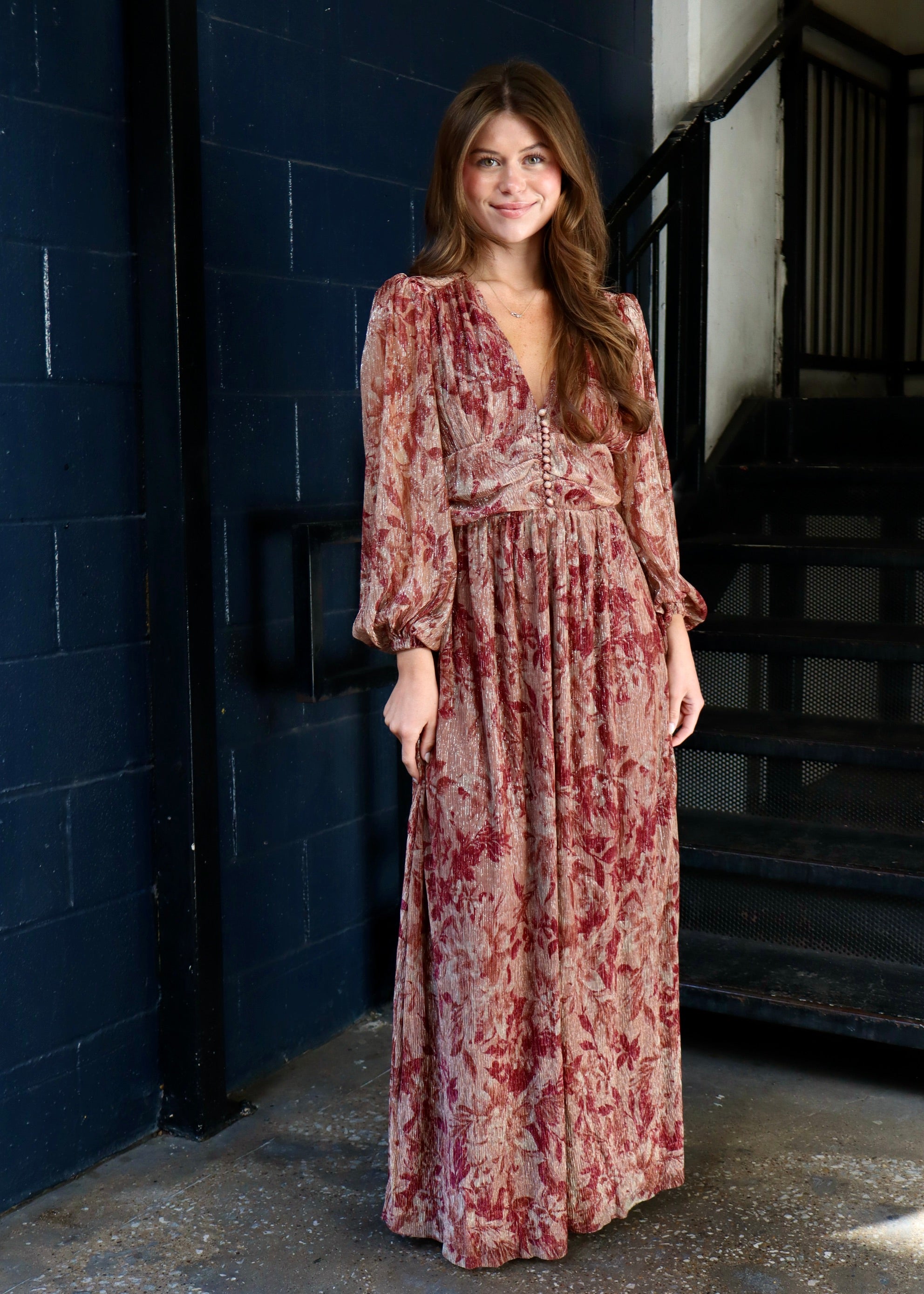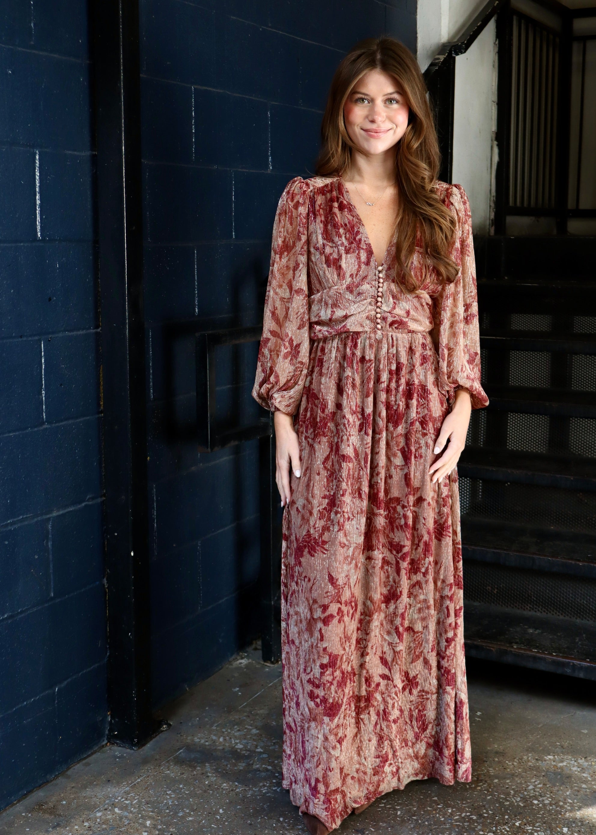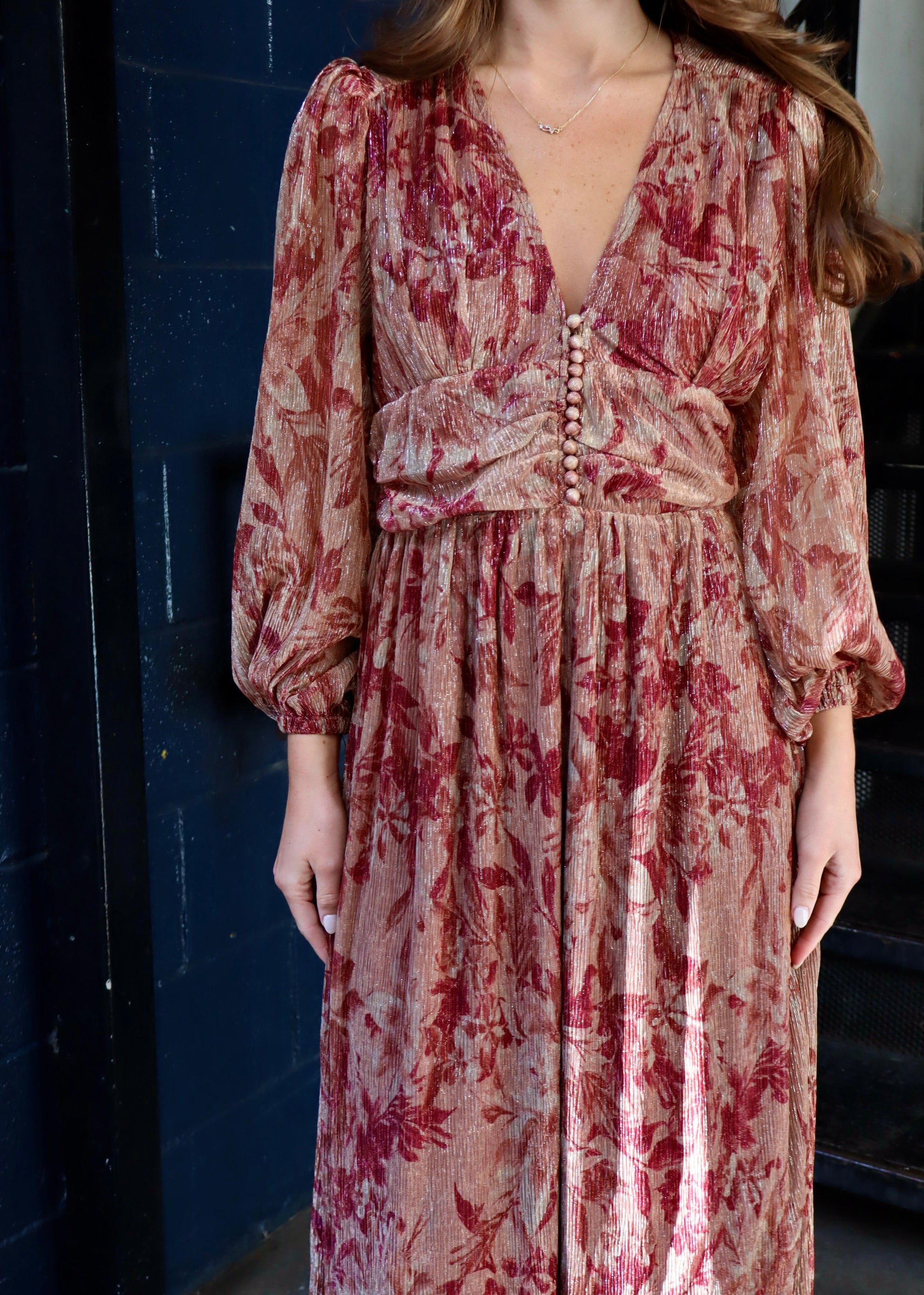 Floral print shimmering gold metallic lurex maxi dress with long sleeves. Model is 5'2" and wearing size Small.