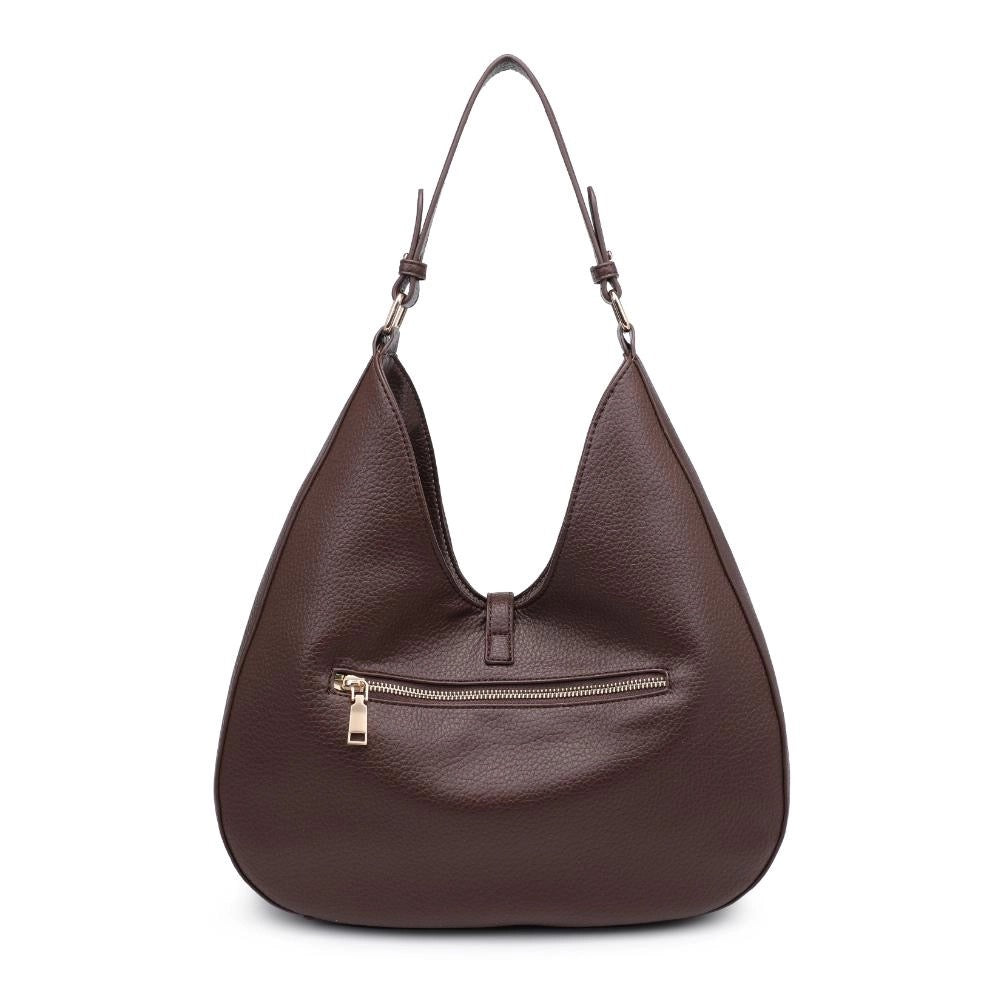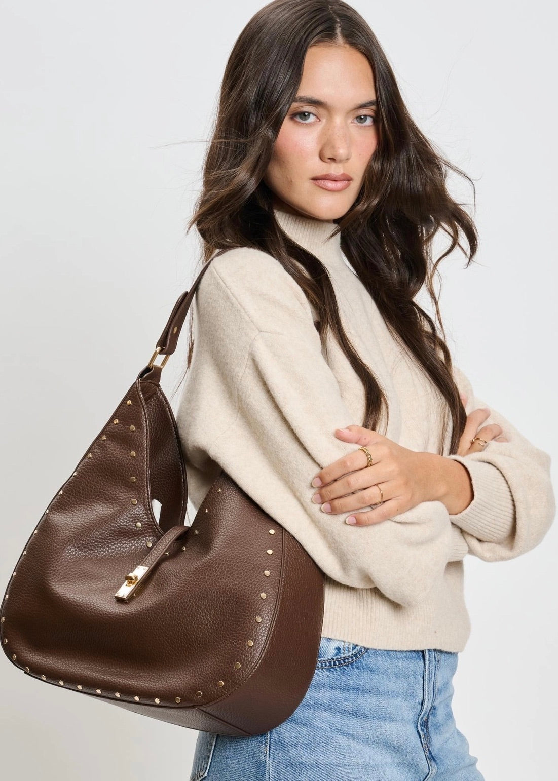 Introducing a hobo bag that effortlessly blends edge with elegance, crafted from pebbled vegan leather. The exterior boasts stud embellishments and gold hardware, while the turn lock loop closure adds a touch of sophistication. Inside, a printed fabric lining, one zip pocket, and two slip pockets ensure your essentials are stylishly organized.
