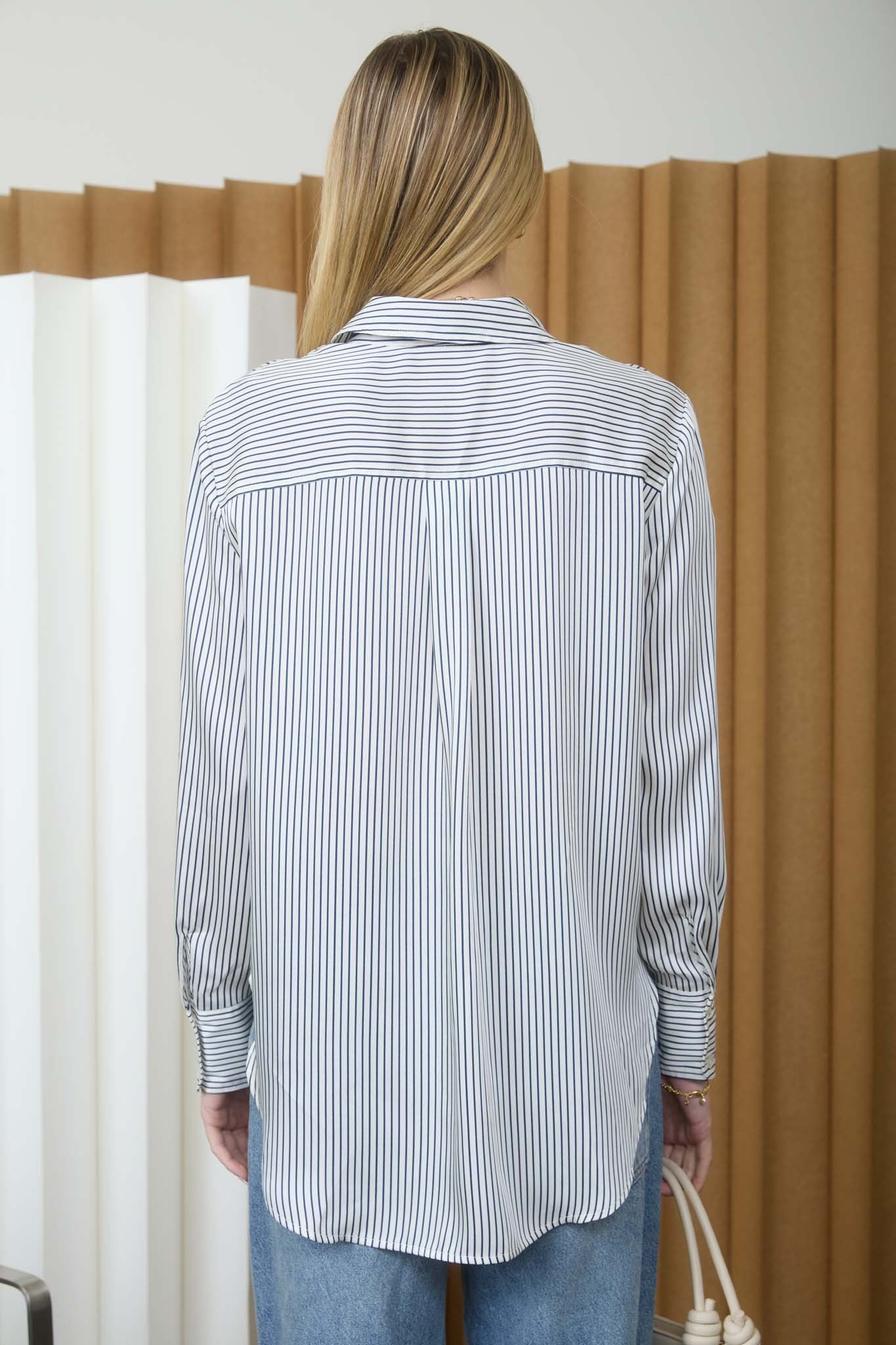 Pinstripe button down collared blouse. Relaxed fit. Model is wearing a size small.