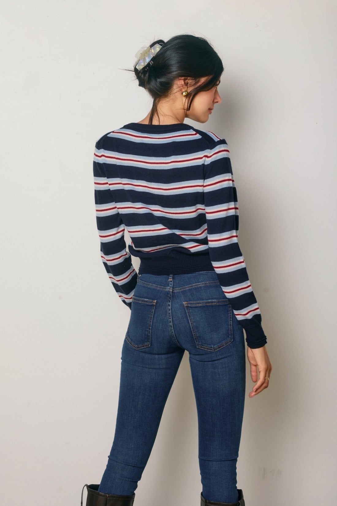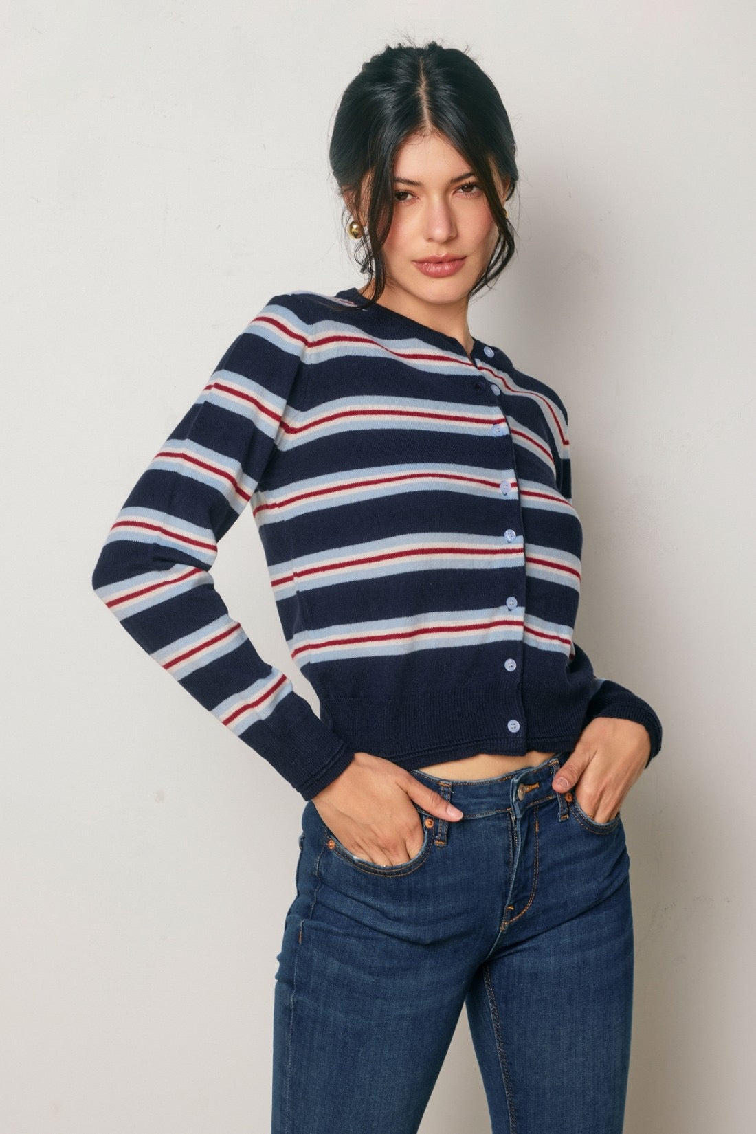 Striped cardigan. Model is wearing size Small.