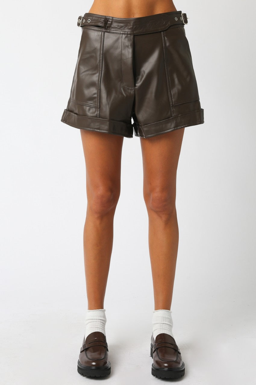 Our Tess faux leather Shorts features a thigh length and pocket. Front zipper closure. Model is wearing a size small.