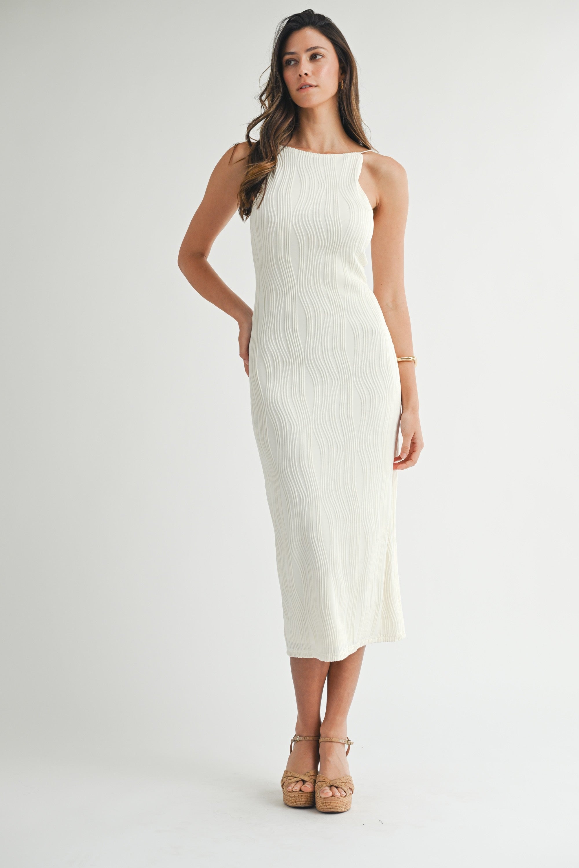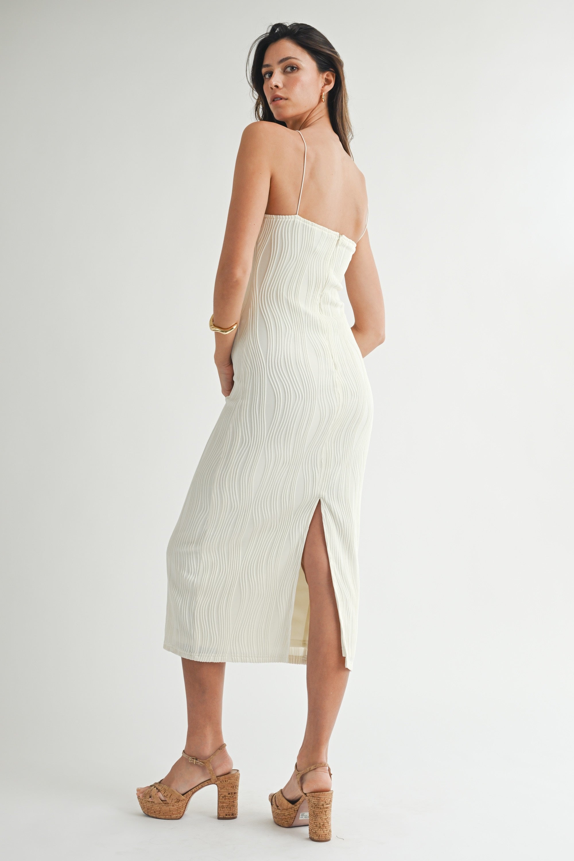 Textured curvy line spaghetti strap high square neckline bodycon midi dress. Back invisible zipper. Lining.