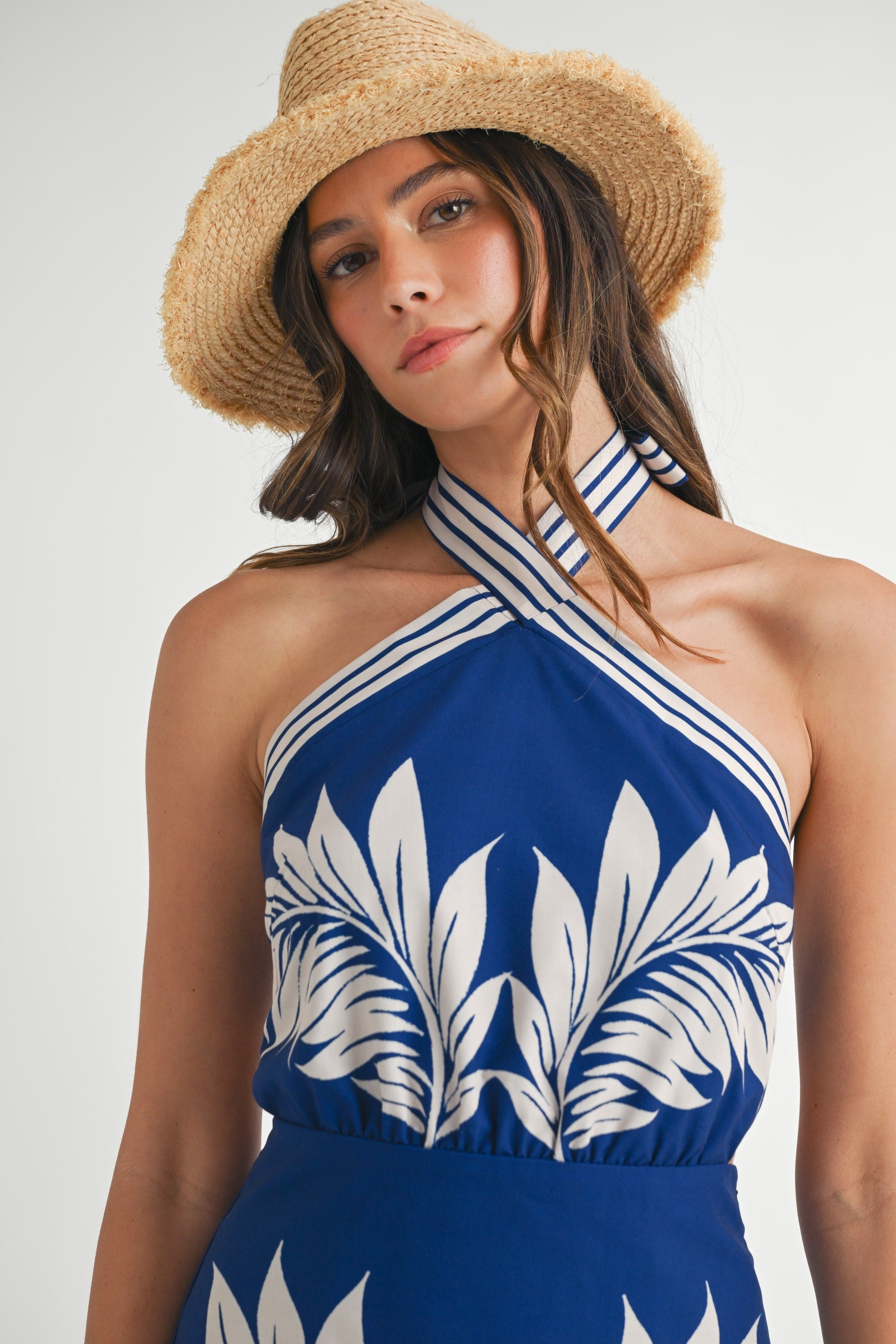 Placement tropical print criss cross halter neckline open back mini dress with back self tie detail. Side invisible zipper. Lining.
