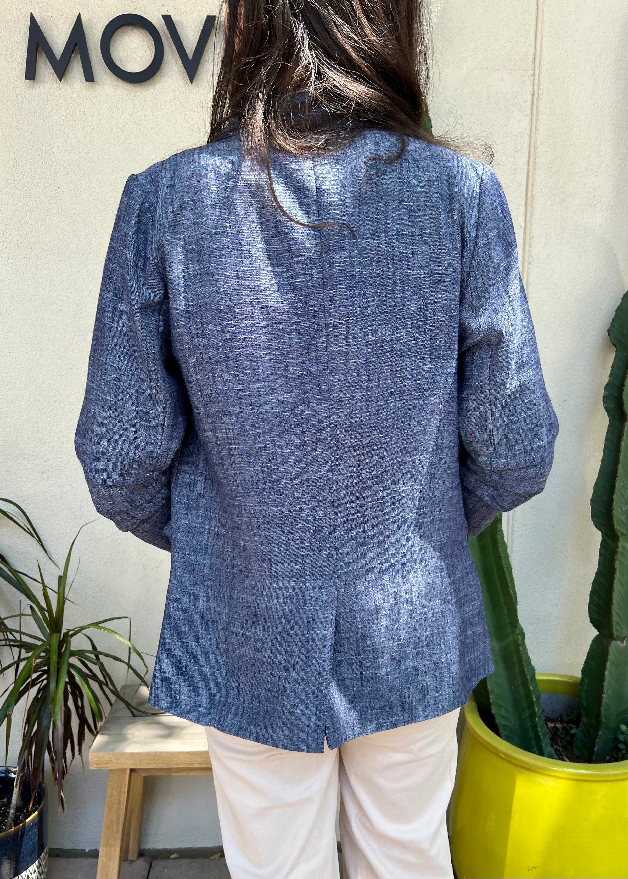 Chambray denim blazer with silver buttons and 3/4 sleeve ruched sleeves.