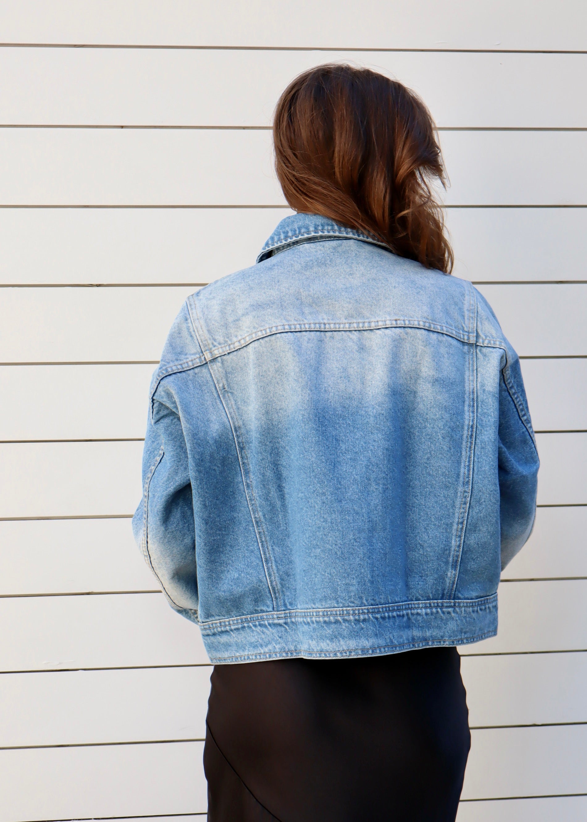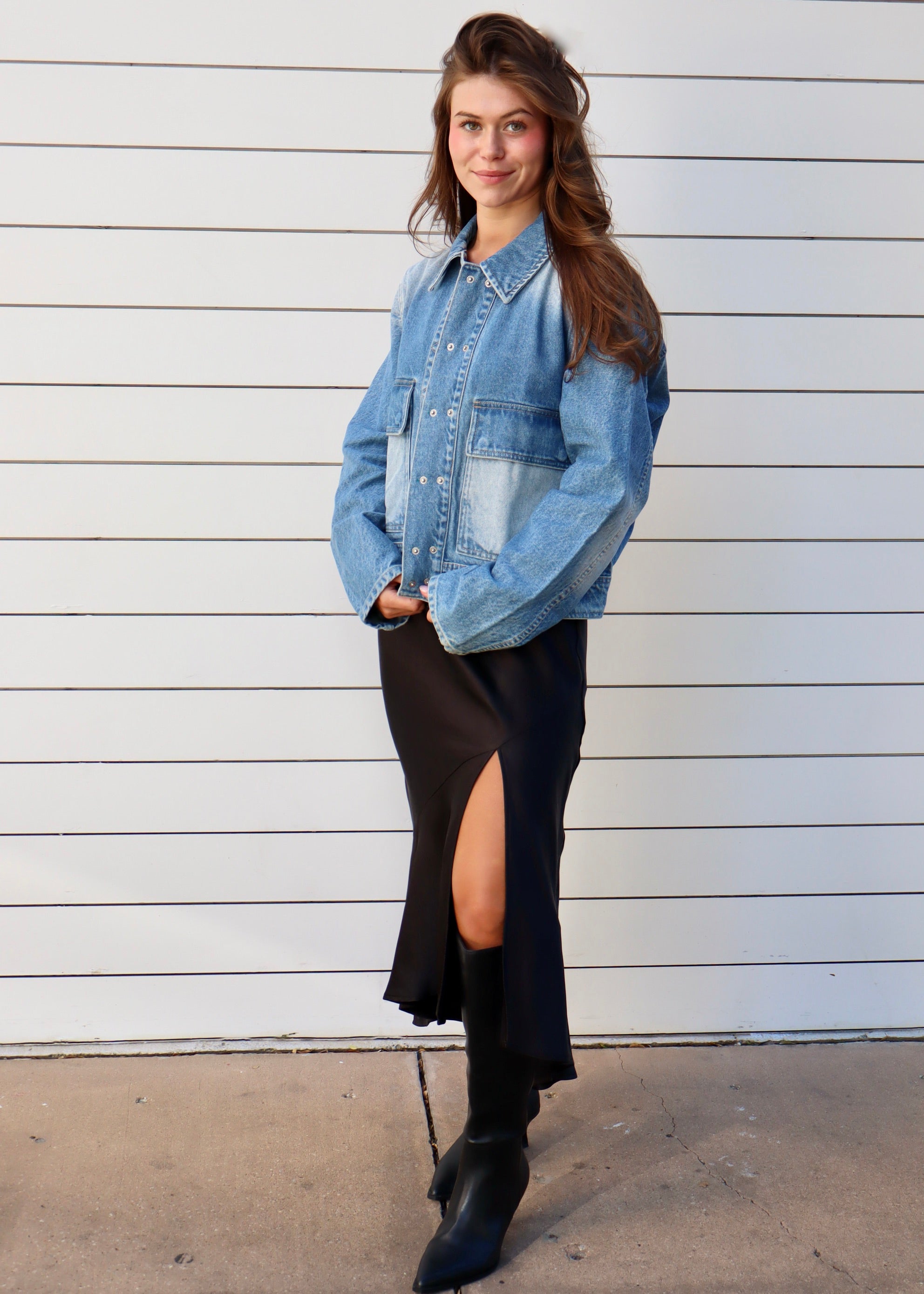 Denim long sleeve jacket featuring a double snap button down front, a collared neckline, two flap pockets with side pocket openings, added seams and is a relaxed fit body.