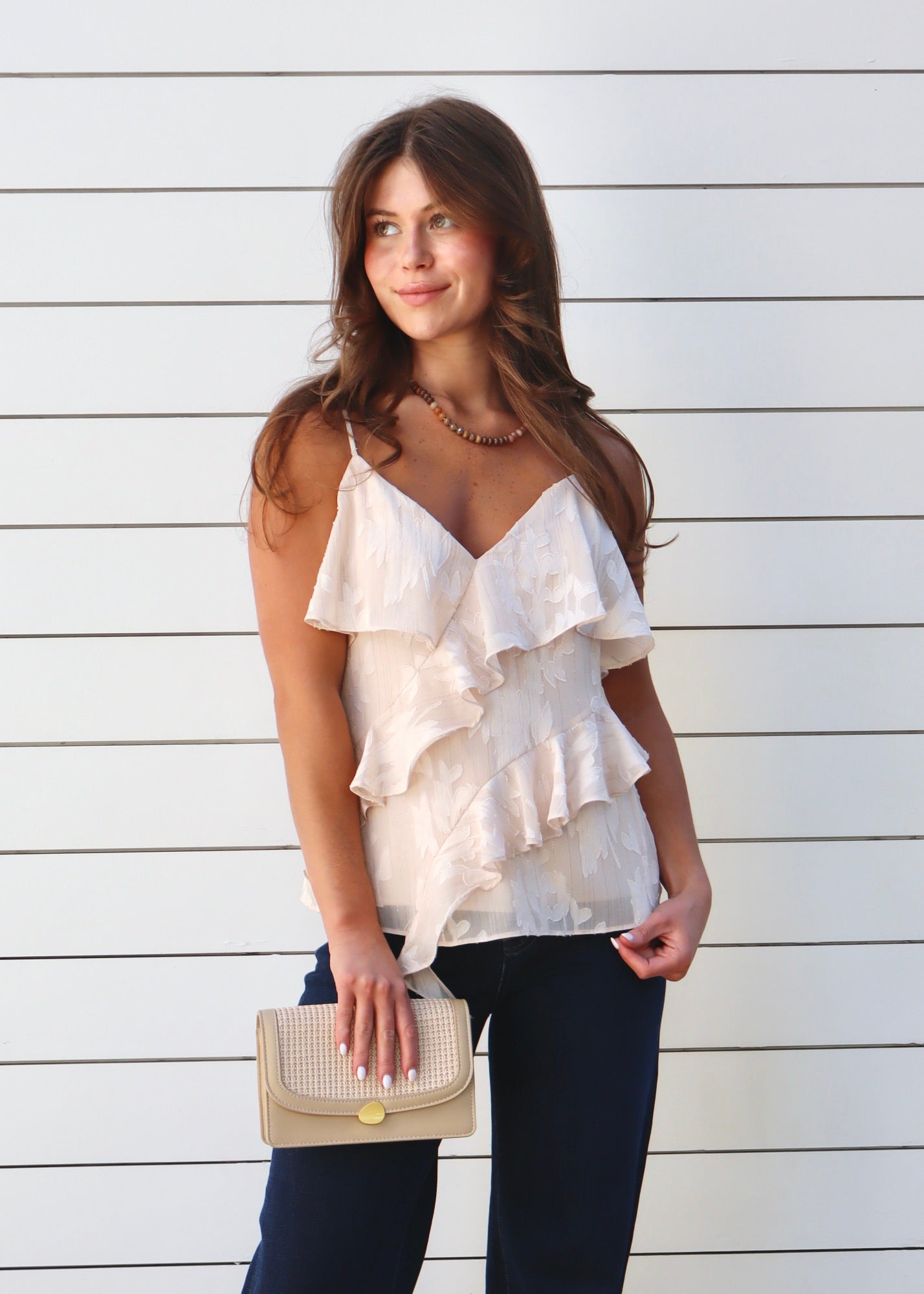 Effortlessly feminine and timeless, this blush-toned camisole features delicate spaghetti straps and cascading asymmetrical ruffles that add graceful movement and texture.