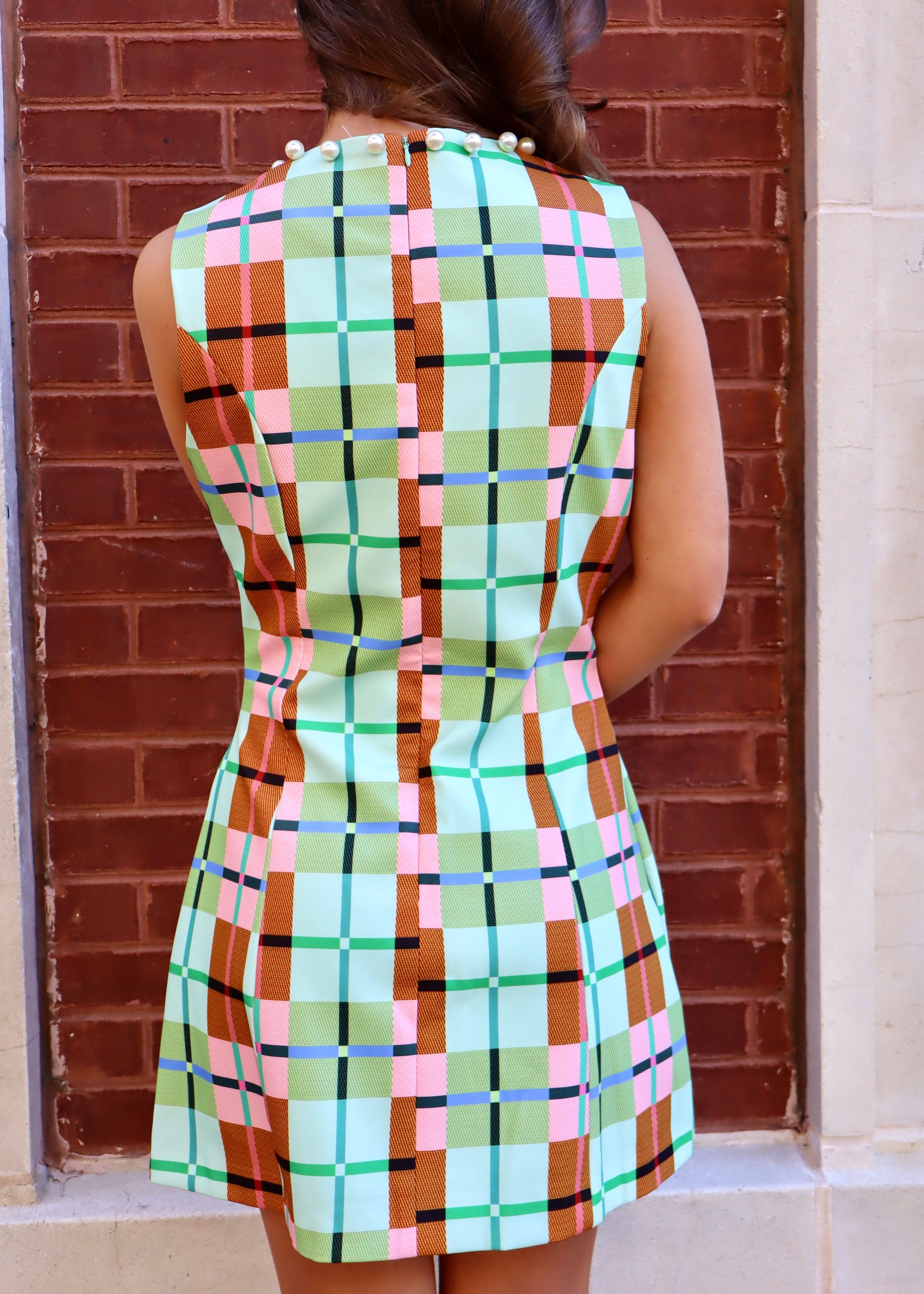 Chic sleeveless plaid mini shift dress with pearl detailed neckline. Back zipper closure, lined.