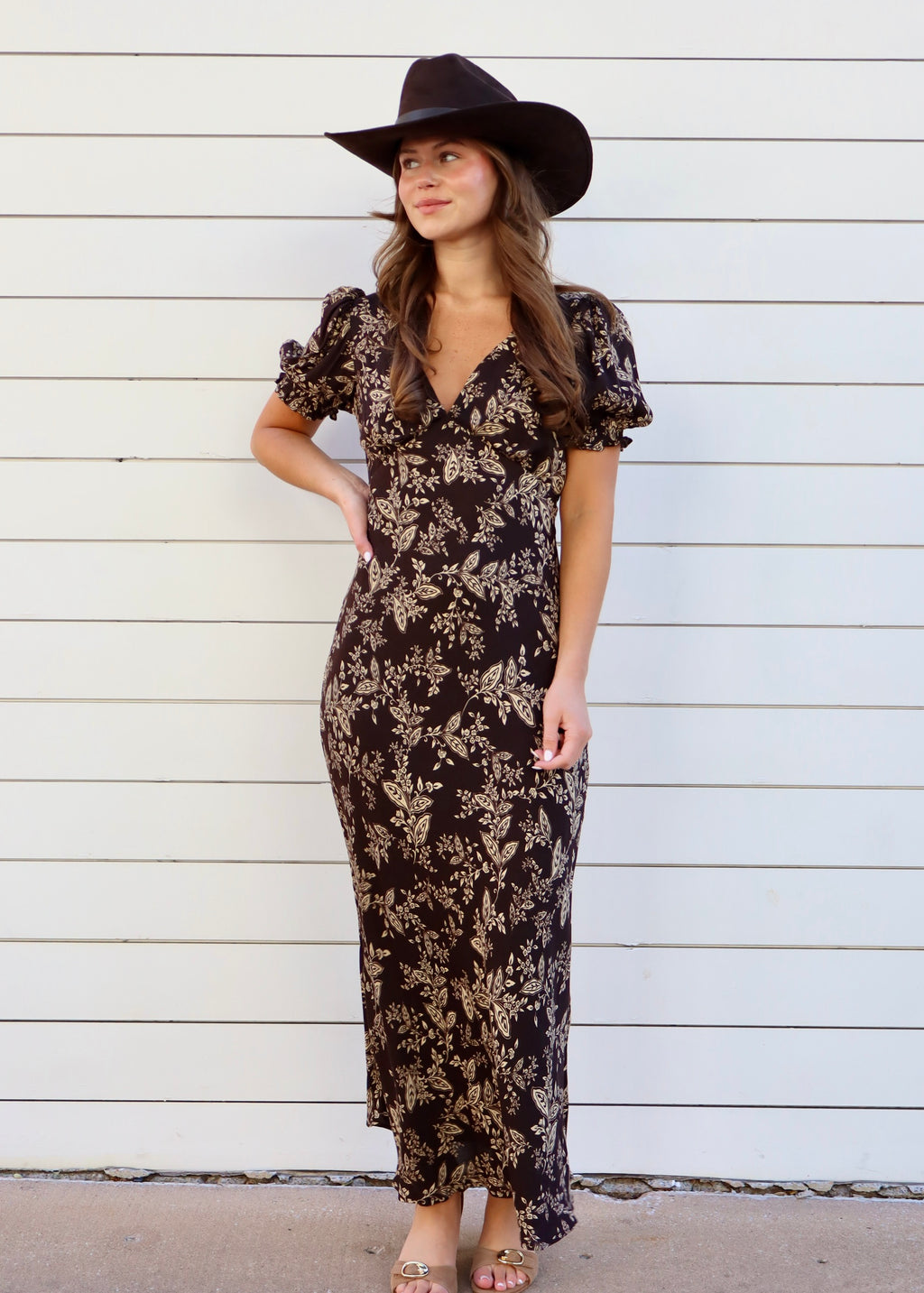 PAISLEY FLORAL MIDI DRESS- BROWN