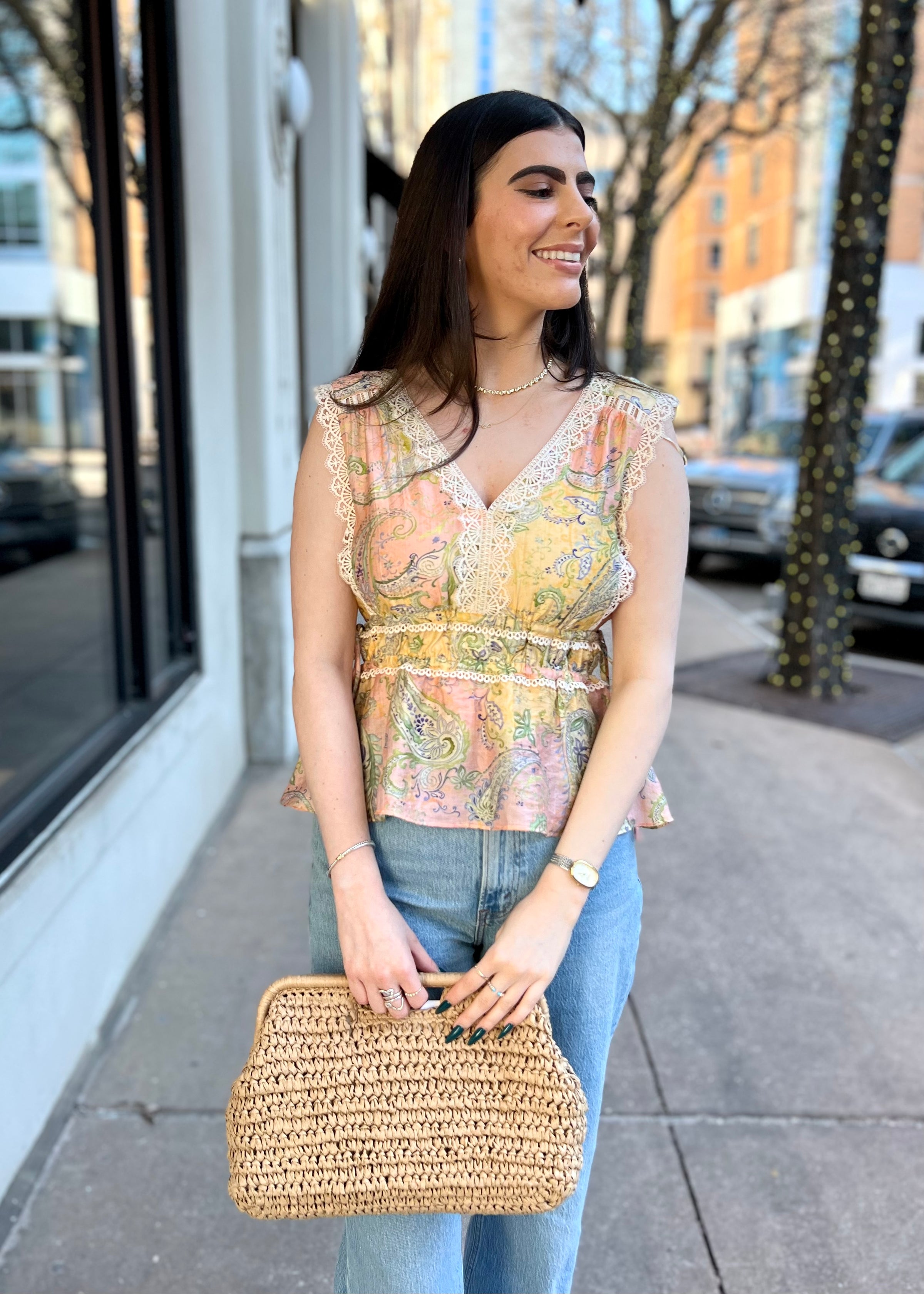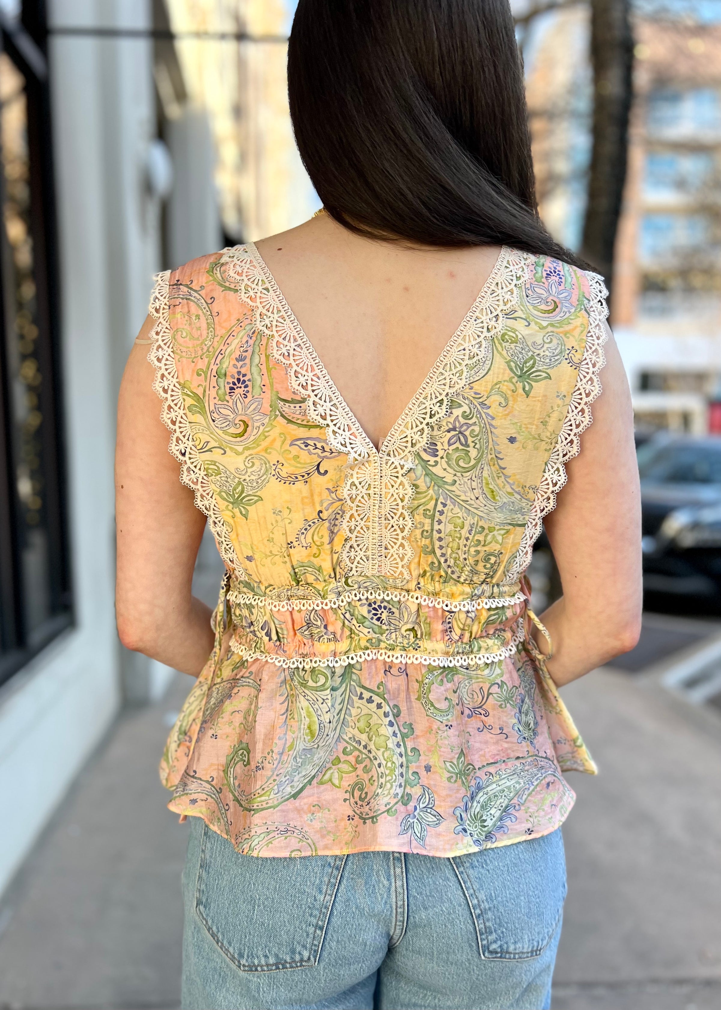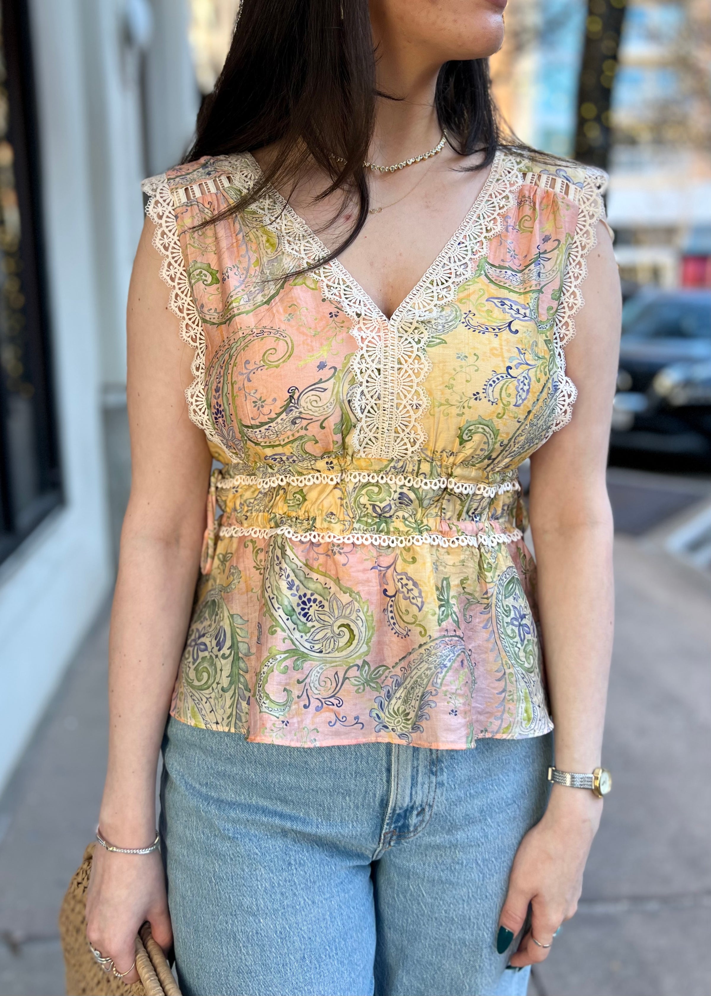 A romantic sleeveless top featuring an allover paisley print and delicate lace trim for a soft, vintage-inspired look. Designed with a lightweight, breathable feel, this top drapes beautifully and layers effortlessly under jackets or cardigans. The lace detailing adds a feminine touch, making it perfect for both casual daytime wear and elevated styling. Pair it with denim, tailored pants, or a flowing skirt for an easy boho-chic outfit.
