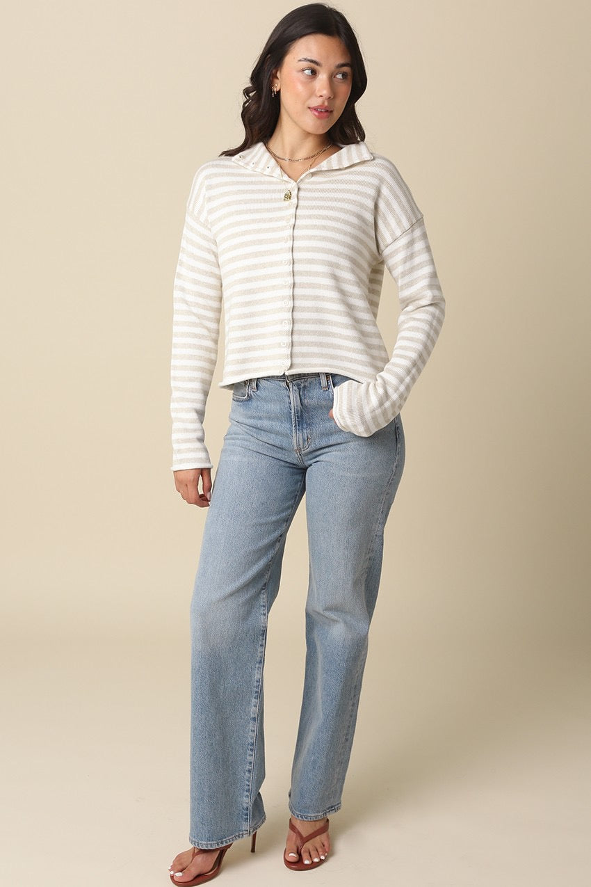 Our Elina Striped Collar Knit Top features a soft, stretchy ribbed fabric that contours the body for a flattering fit and a minimal button front collar design that adds a clean, modern touch.