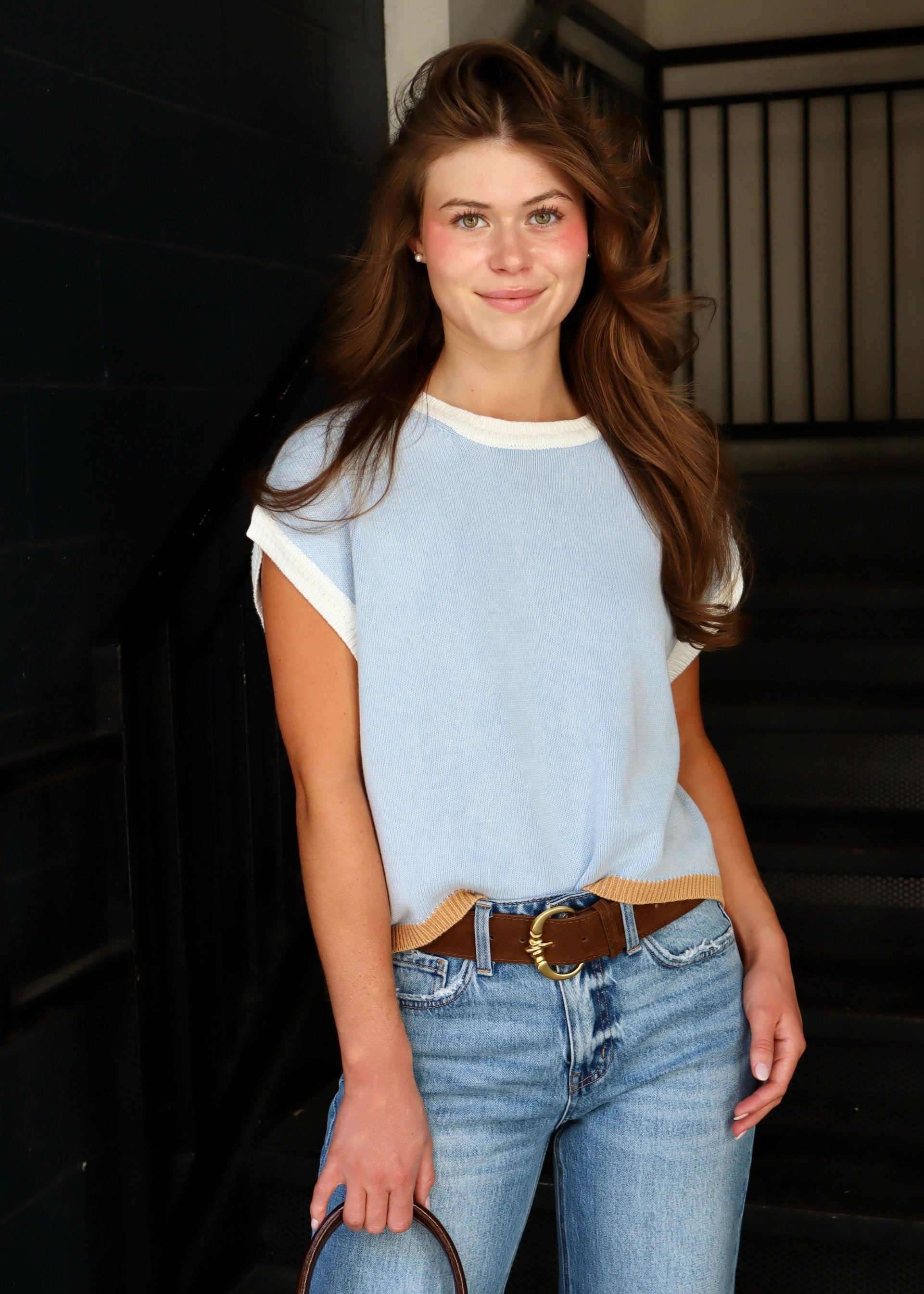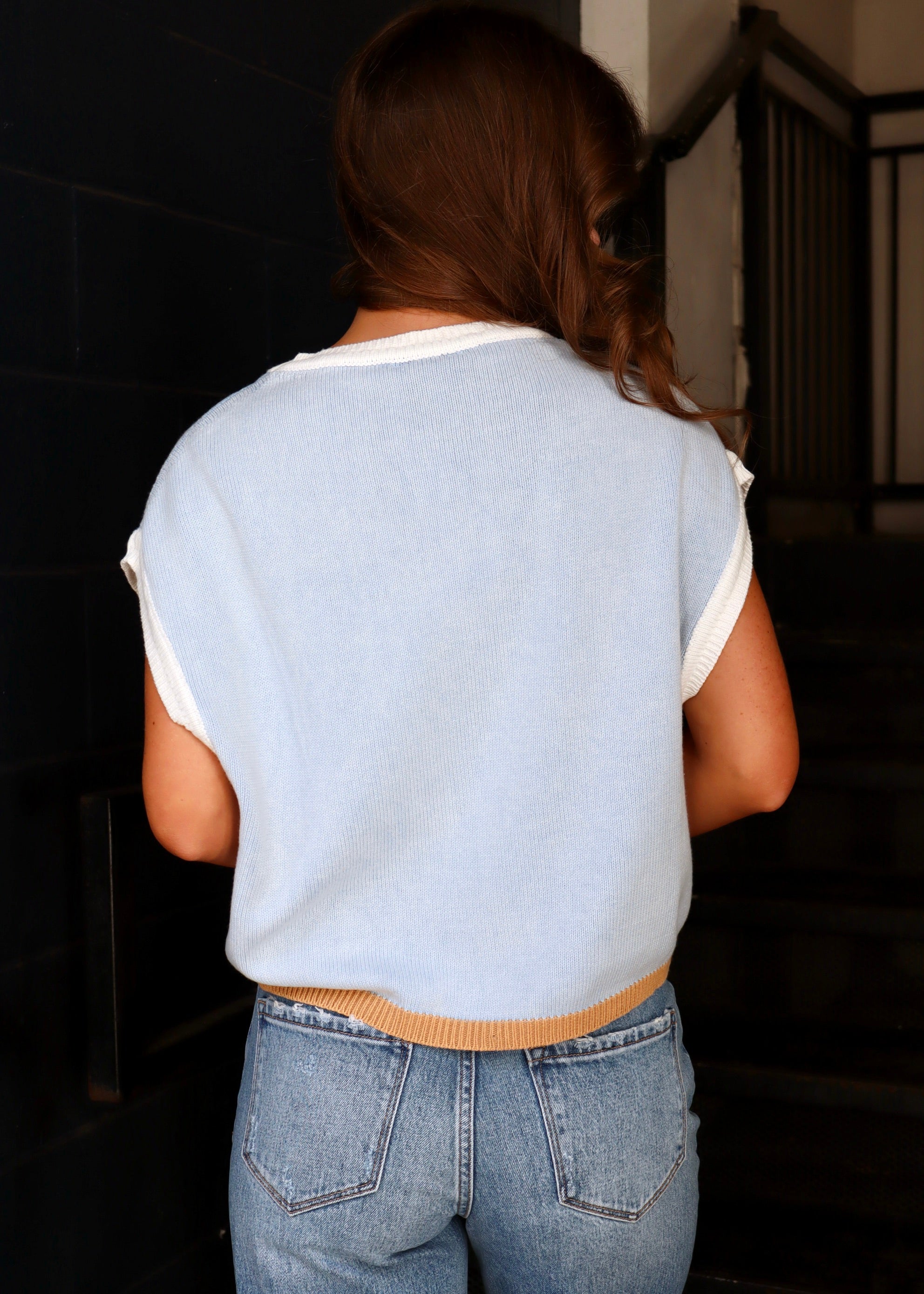 Mineral washed sleeveless sweater top featuring a ribbed round neckline, cap sleeves with ribbed cuffs, a different colored bottom trim and is a relaxed fit body.
