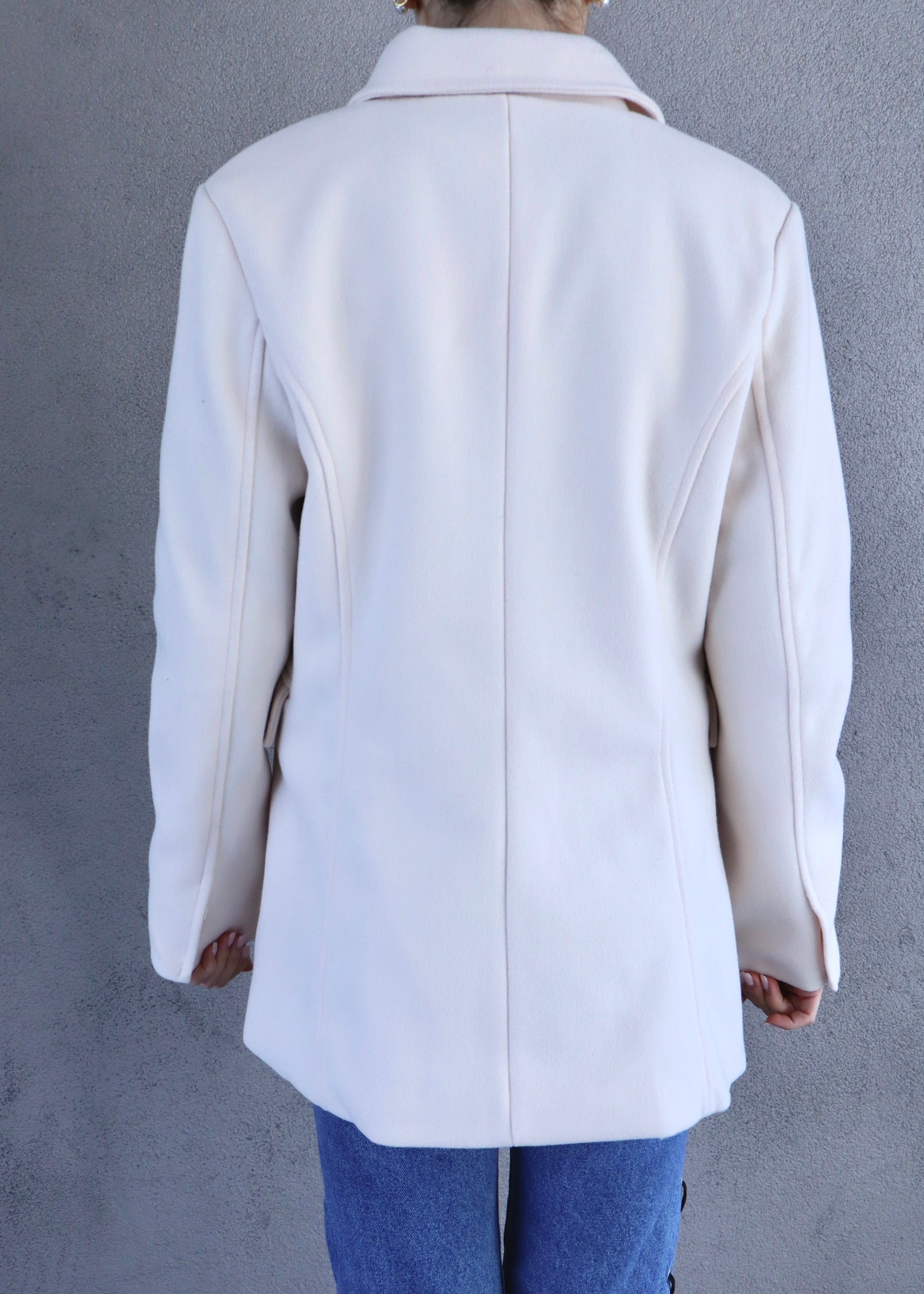 Classic double breasted peacoat with gold button hardware and side pockets.
