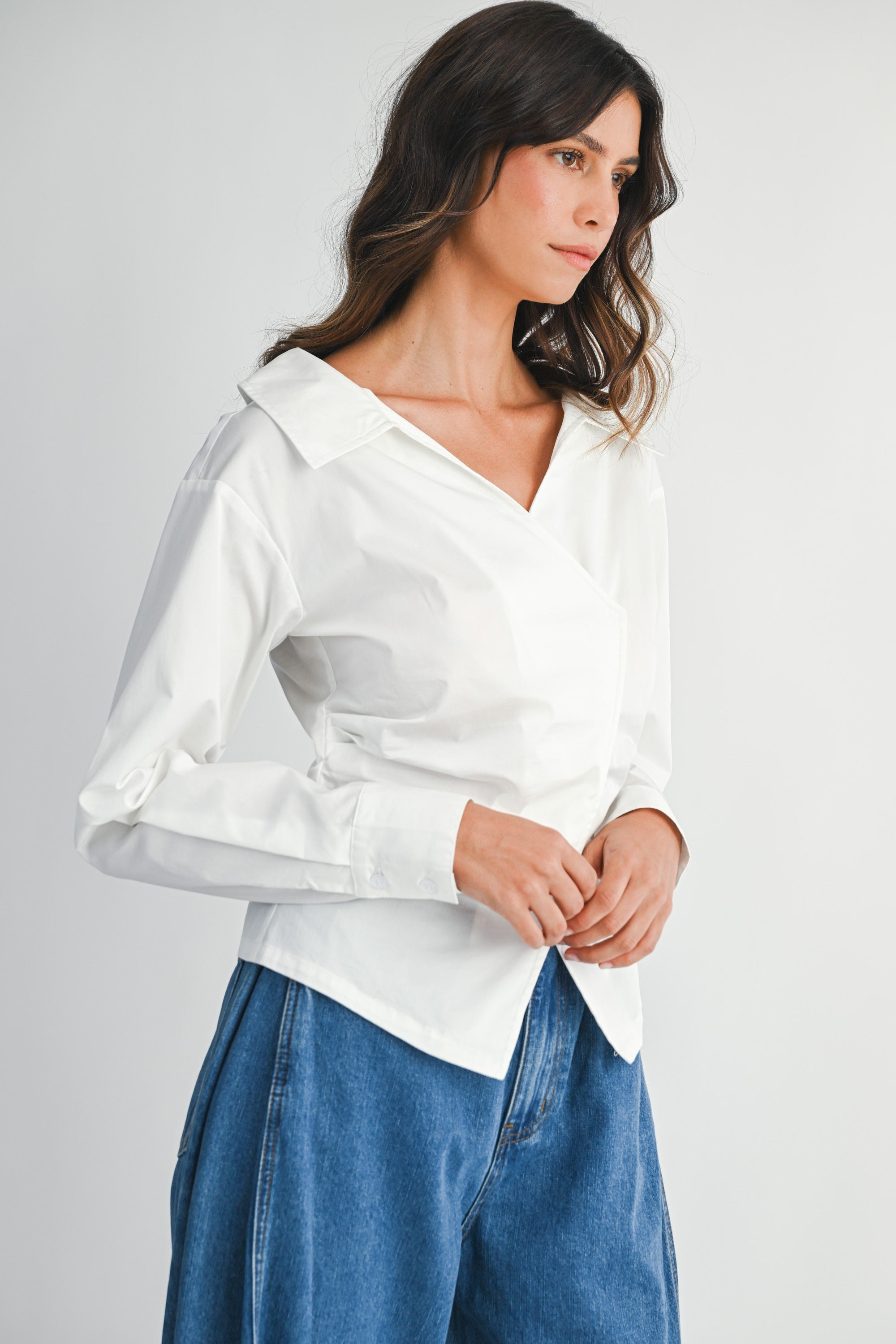 Long sleeve blouse top with an asymmetric wrap front, pointed collars, V-neckline, and fitted waist. Side invisible zip closure. Cotton fabrication but with a touch of stretch for a comfortable fit. Model is wearing a size small.