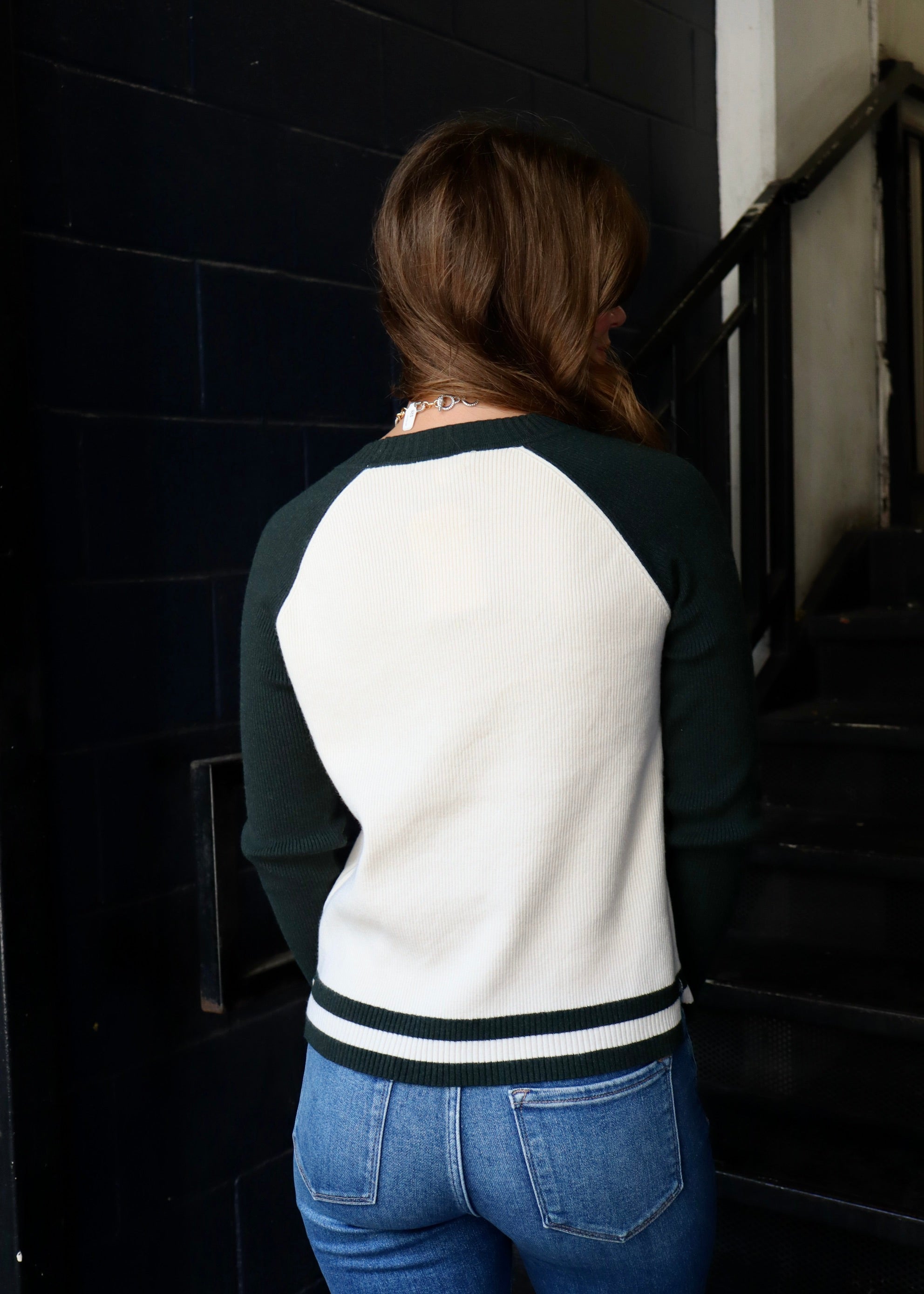 This sporty-chic ribbed knit top features a classic colorblock design with a cream front and contrasting dark green sleeves and back.